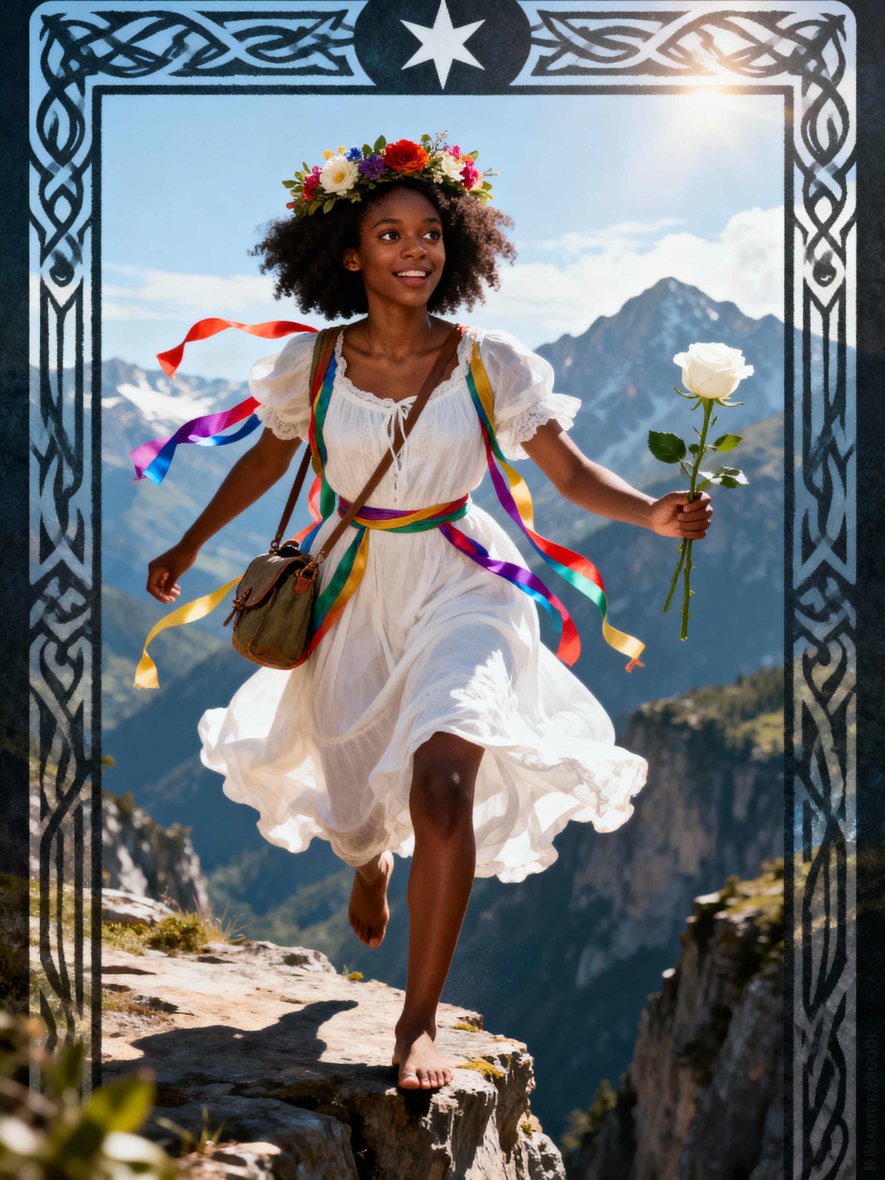 Tarot Card of The Fool featuring model wearing flowing white dress with flower crown and colorful ribbons , stepping forward with one foot off a cliff edge, carrying a small bag, white rose in hand, bright mountain landscape background, carefree expression, tarot card illustration style