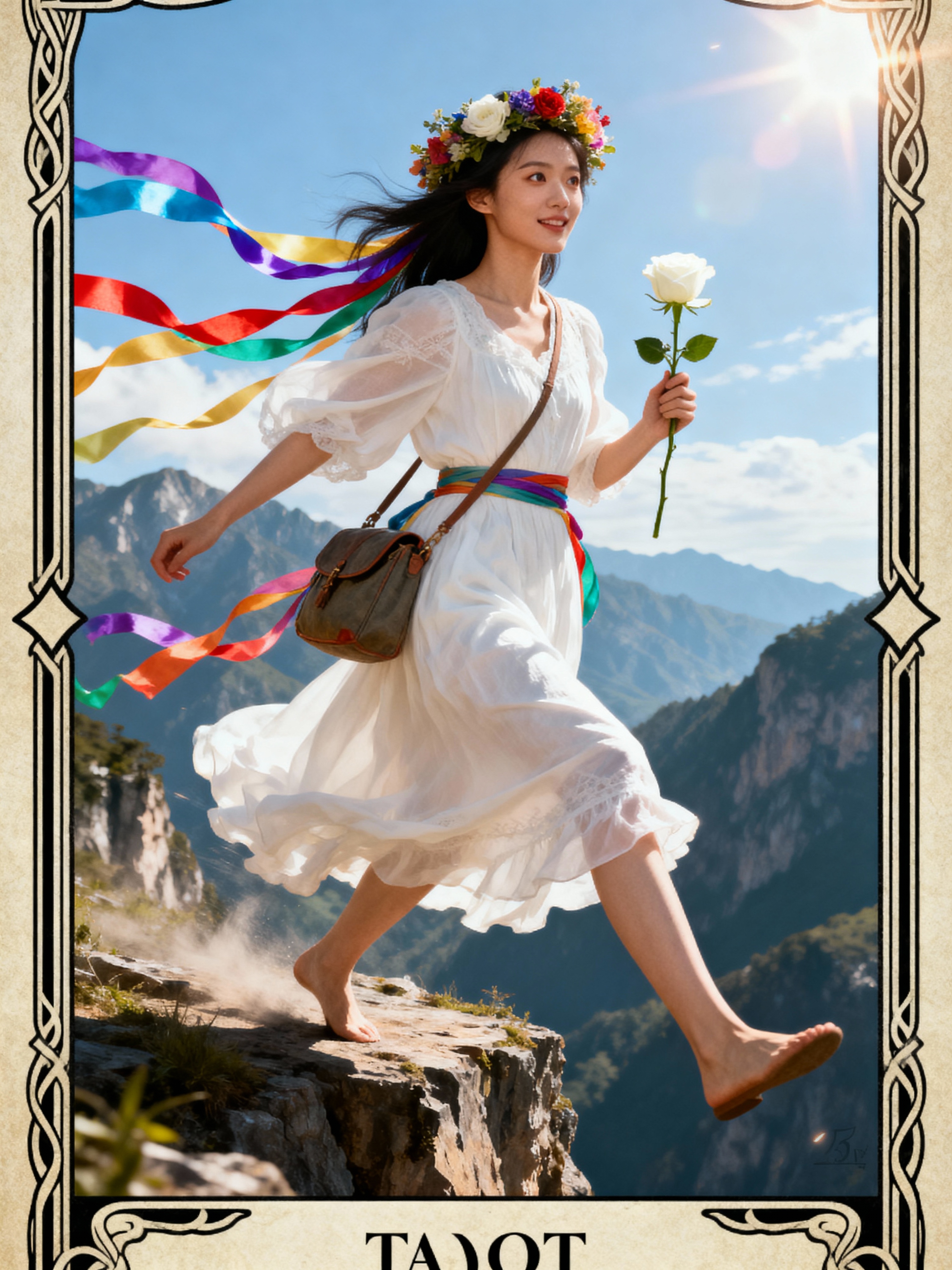 Tarot Card of The Fool featuring model wearing flowing white dress with flower crown and colorful ribbons , stepping forward with one foot off a cliff edge, carrying a small bag, white rose in hand, bright mountain landscape background, carefree expression, tarot card illustration style