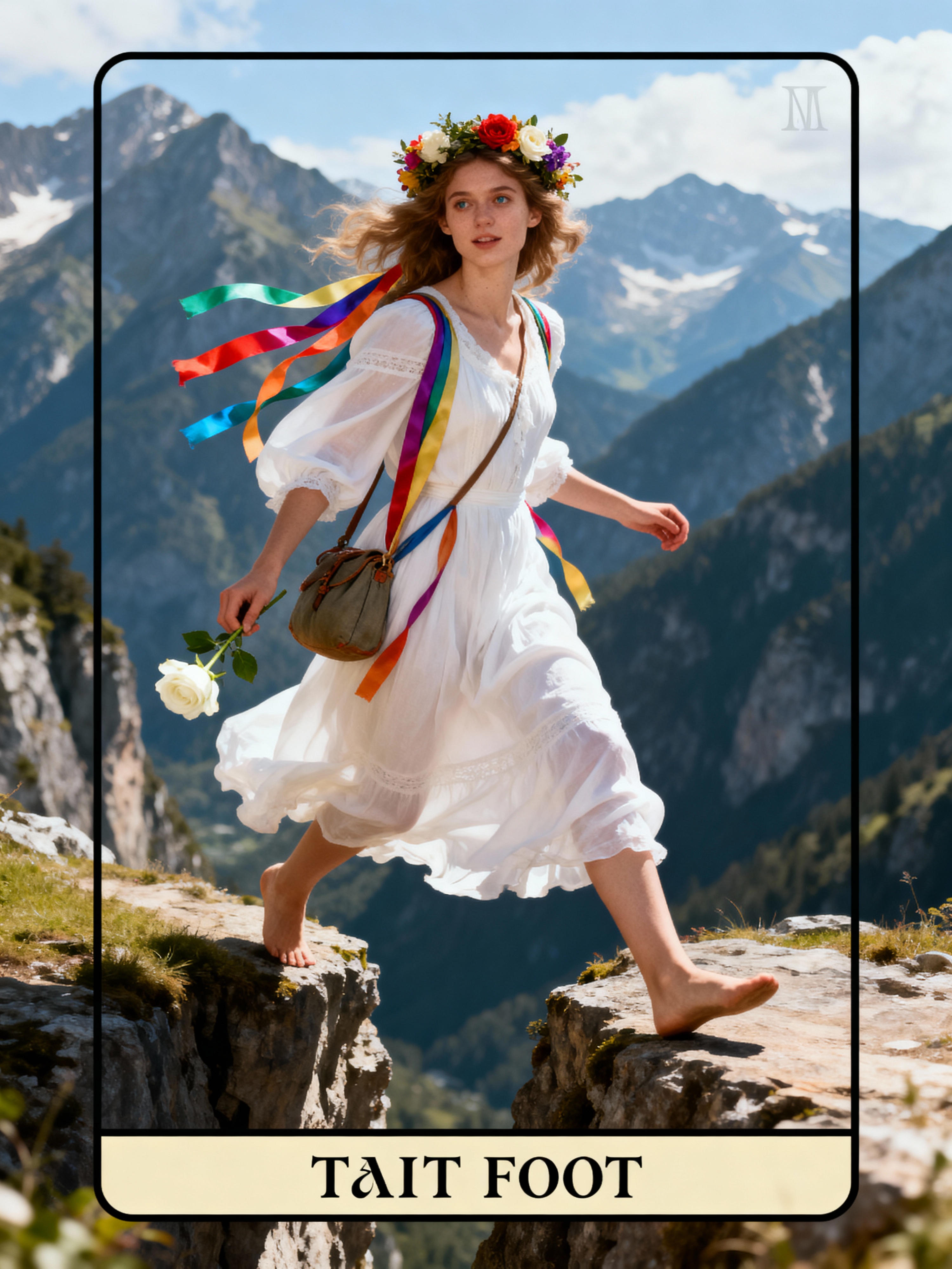 Tarot Card of The Fool featuring model wearing flowing white dress with flower crown and colorful ribbons , stepping forward with one foot off a cliff edge, carrying a small bag, white rose in hand, bright mountain landscape background, carefree expression, tarot card illustration style