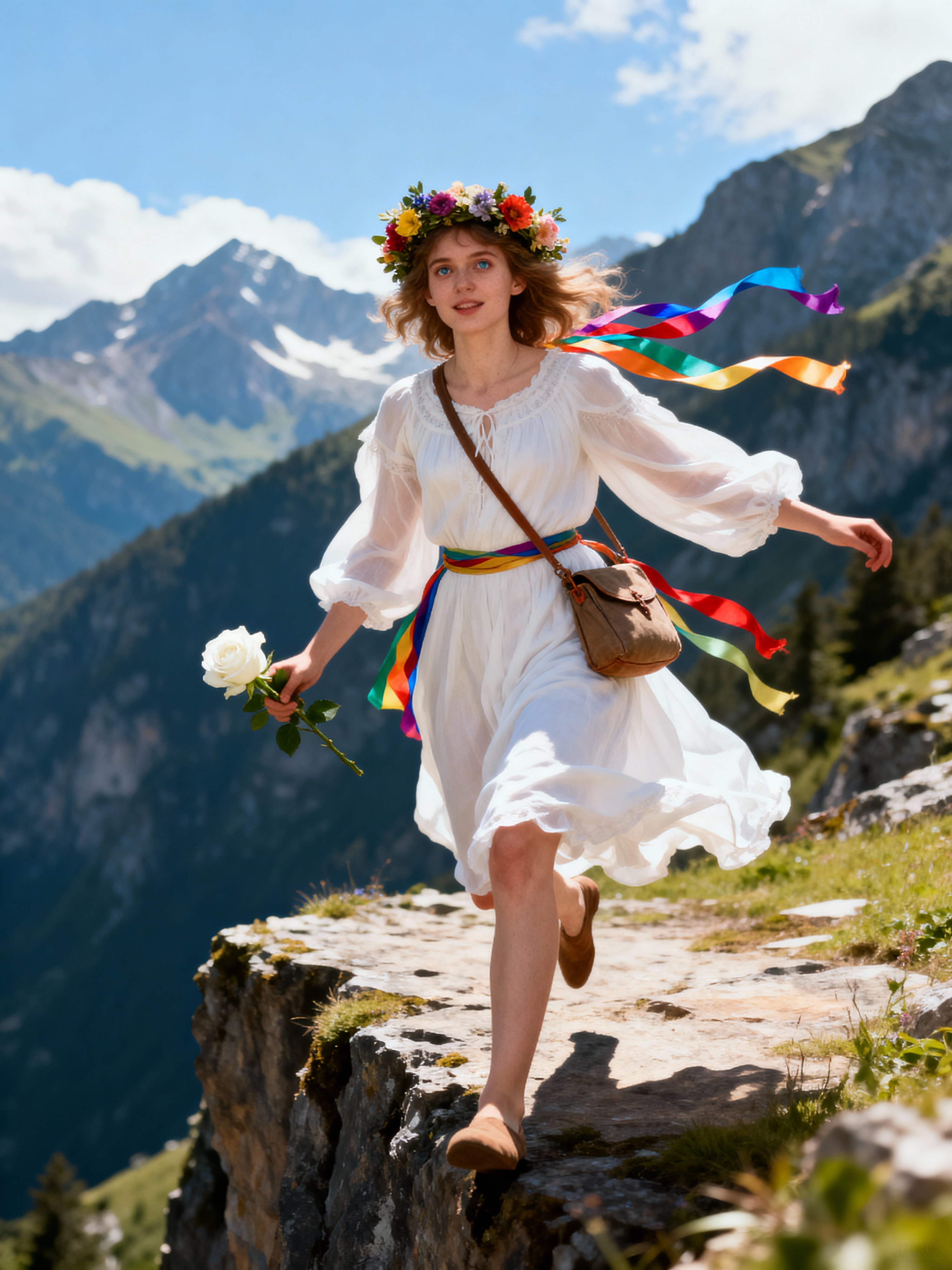 Tarot Card of The Fool featuring model wearing flowing white dress with flower crown and colorful ribbons , stepping forward with one foot off a cliff edge, carrying a small bag, white rose in hand, bright mountain landscape background, carefree expression, tarot card illustration style