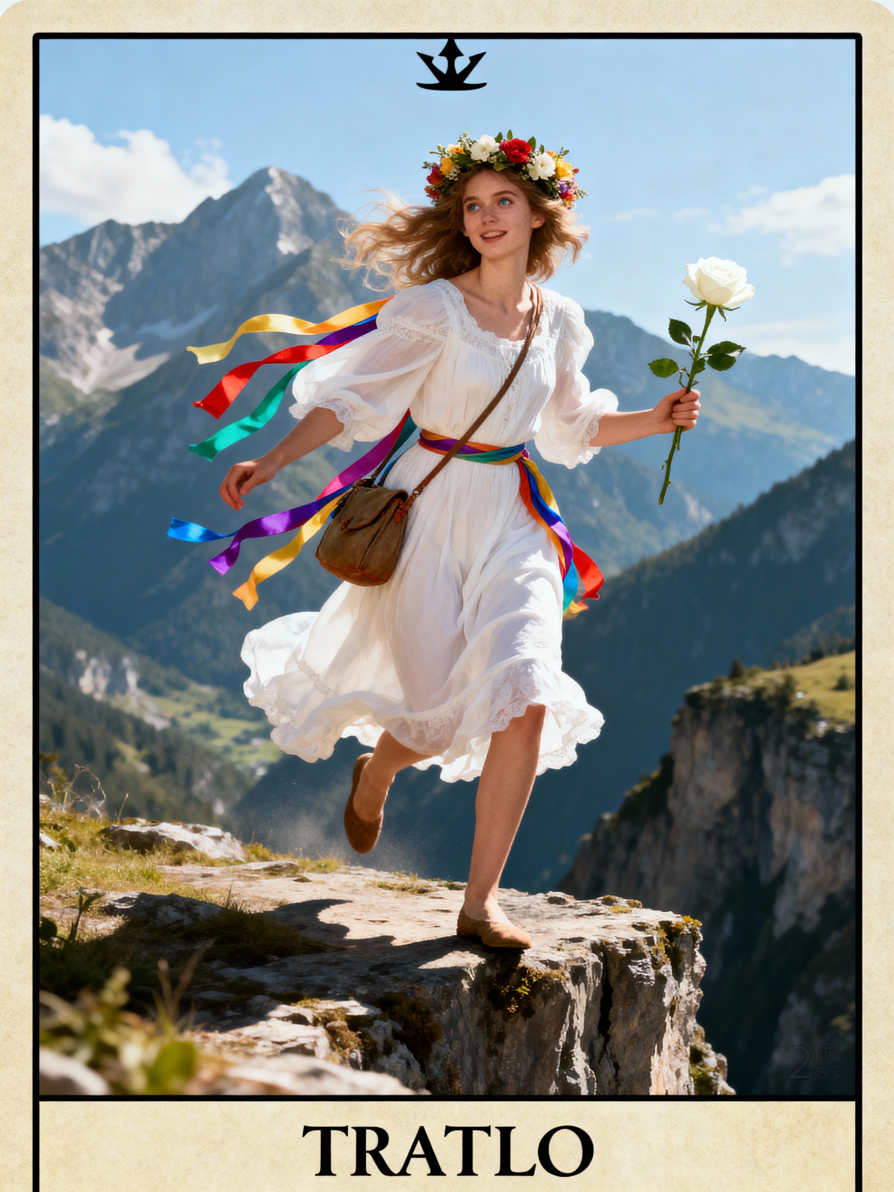 Tarot Card of The Fool featuring model wearing flowing white dress with flower crown and colorful ribbons , stepping forward with one foot off a cliff edge, carrying a small bag, white rose in hand, bright mountain landscape background, carefree expression, tarot card illustration style