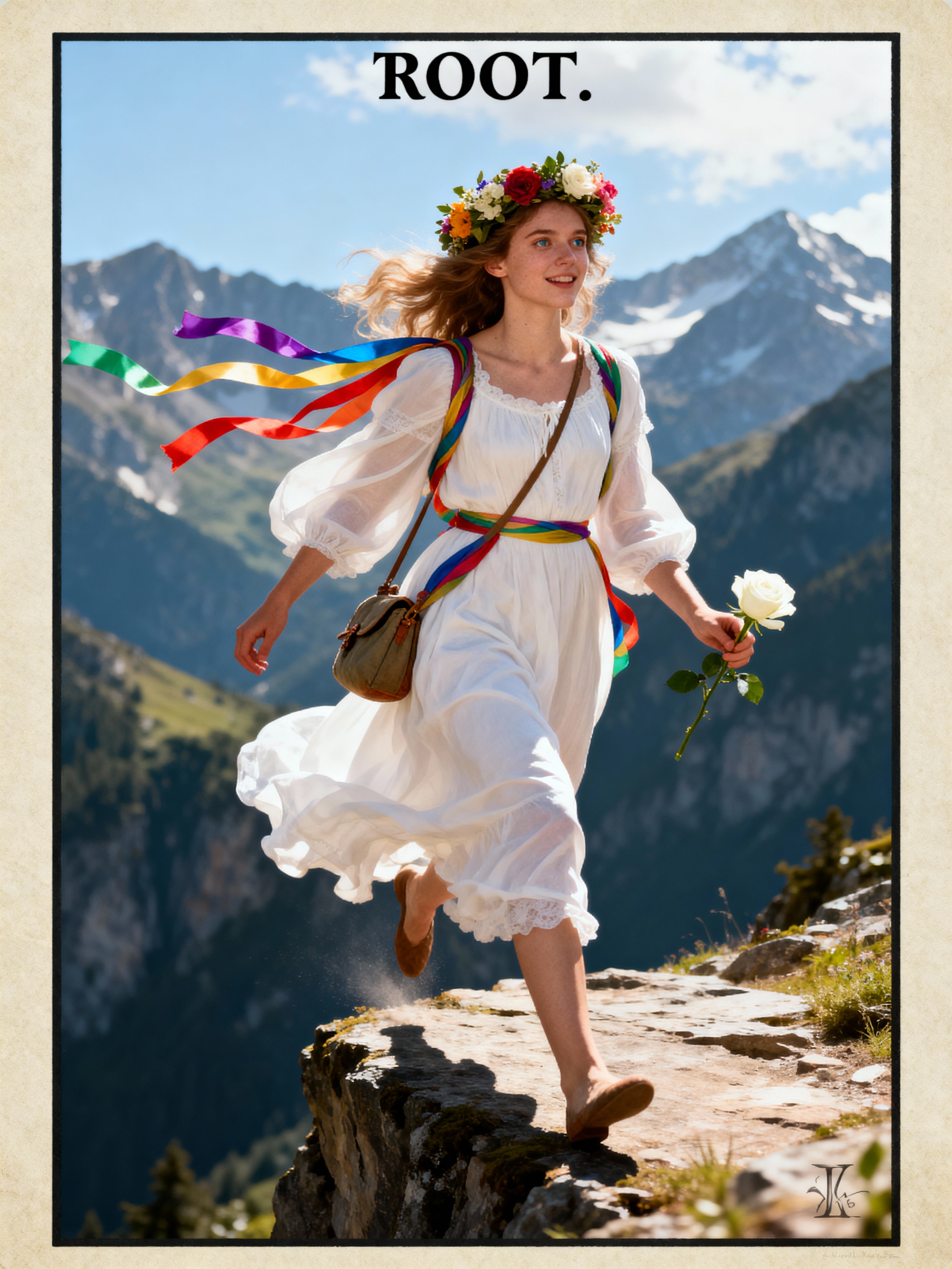 Tarot Card of The Fool featuring model wearing flowing white dress with flower crown and colorful ribbons , stepping forward with one foot off a cliff edge, carrying a small bag, white rose in hand, bright mountain landscape background, carefree expression, tarot card illustration style