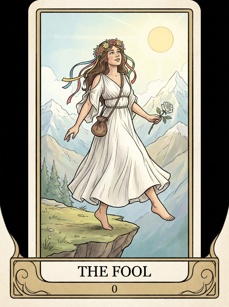 Tarot Card of The Fool featuring model wearing flowing white dress with flower crown and colorful ribbons , stepping forward with one foot off a cliff edge, carrying a small bag, white rose in hand, bright mountain landscape background, carefree expression, tarot card illustration style