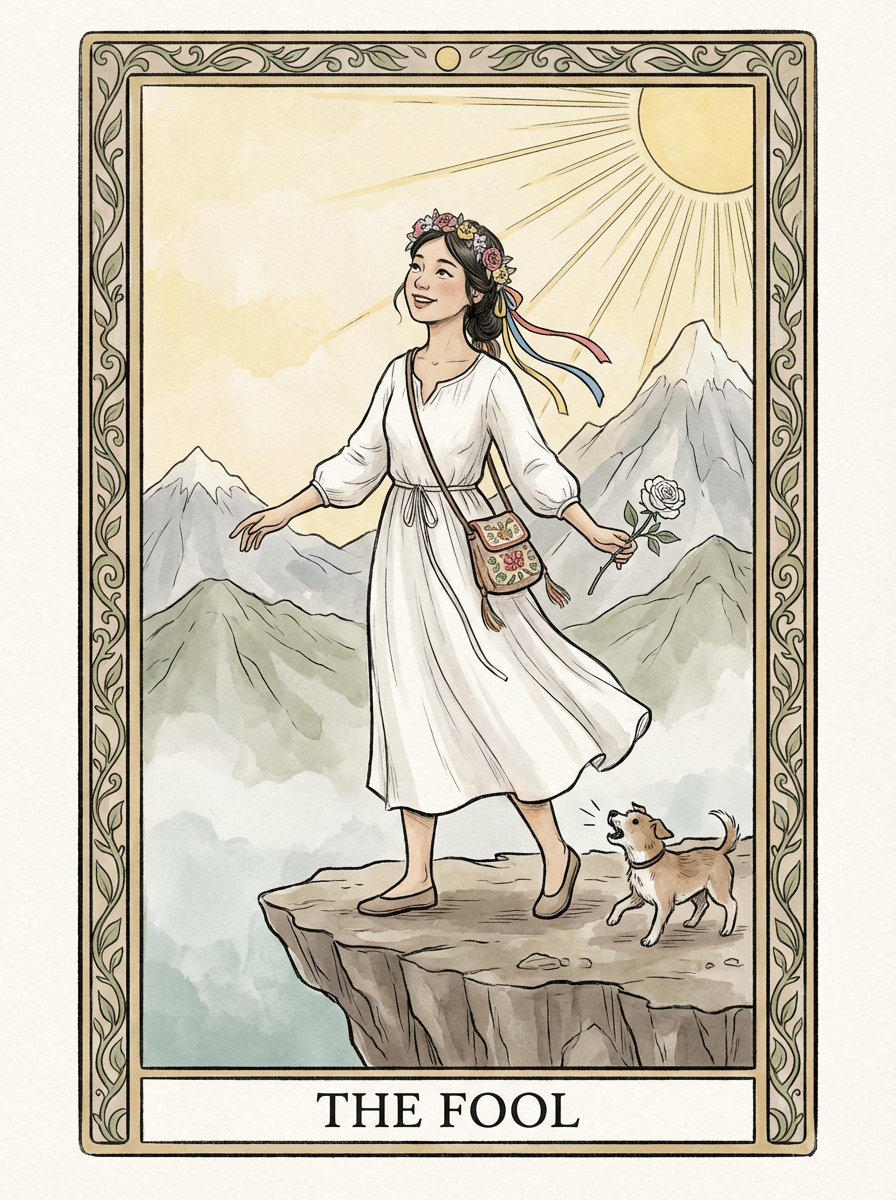 Tarot Card of The Fool featuring model wearing flowing white dress with flower crown and colorful ribbons , stepping forward with one foot off a cliff edge, carrying a small bag, white rose in hand, bright mountain landscape background, carefree expression, tarot card illustration style