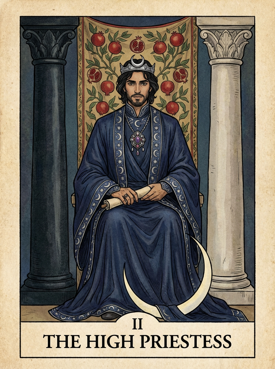 Tarot Card of The High Priestess featuring model wearing flowing indigo robes with lunar crown and mystical pendant, seated between two pillars, scroll of ancient wisdom in lap, pomegranate tapestry behind, crescent moon at feet, serene mystical expression