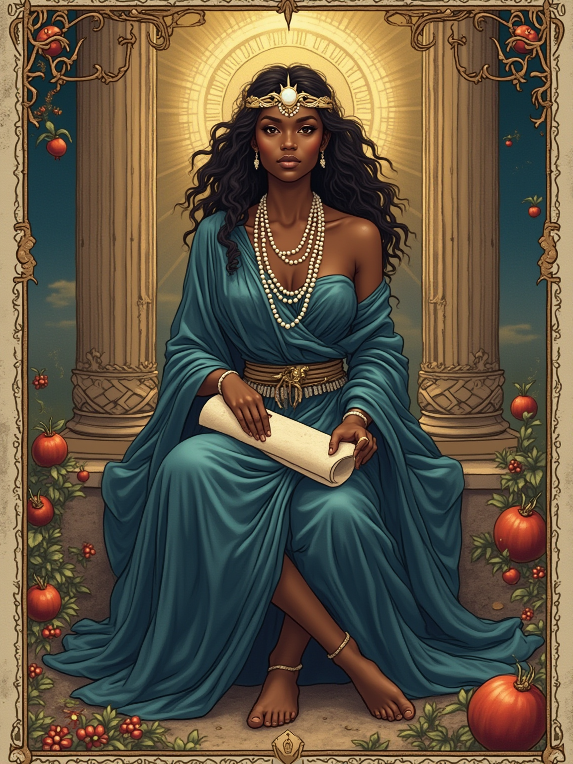 Tarot Card of The High Priestess featuring model wearing flowing blue robes with crescent moon crown and pearl jewelry , seated between two pillars, scroll of ancient wisdom in lap, pomegranate tapestry behind, crescent moon at feet, serene mystical expression