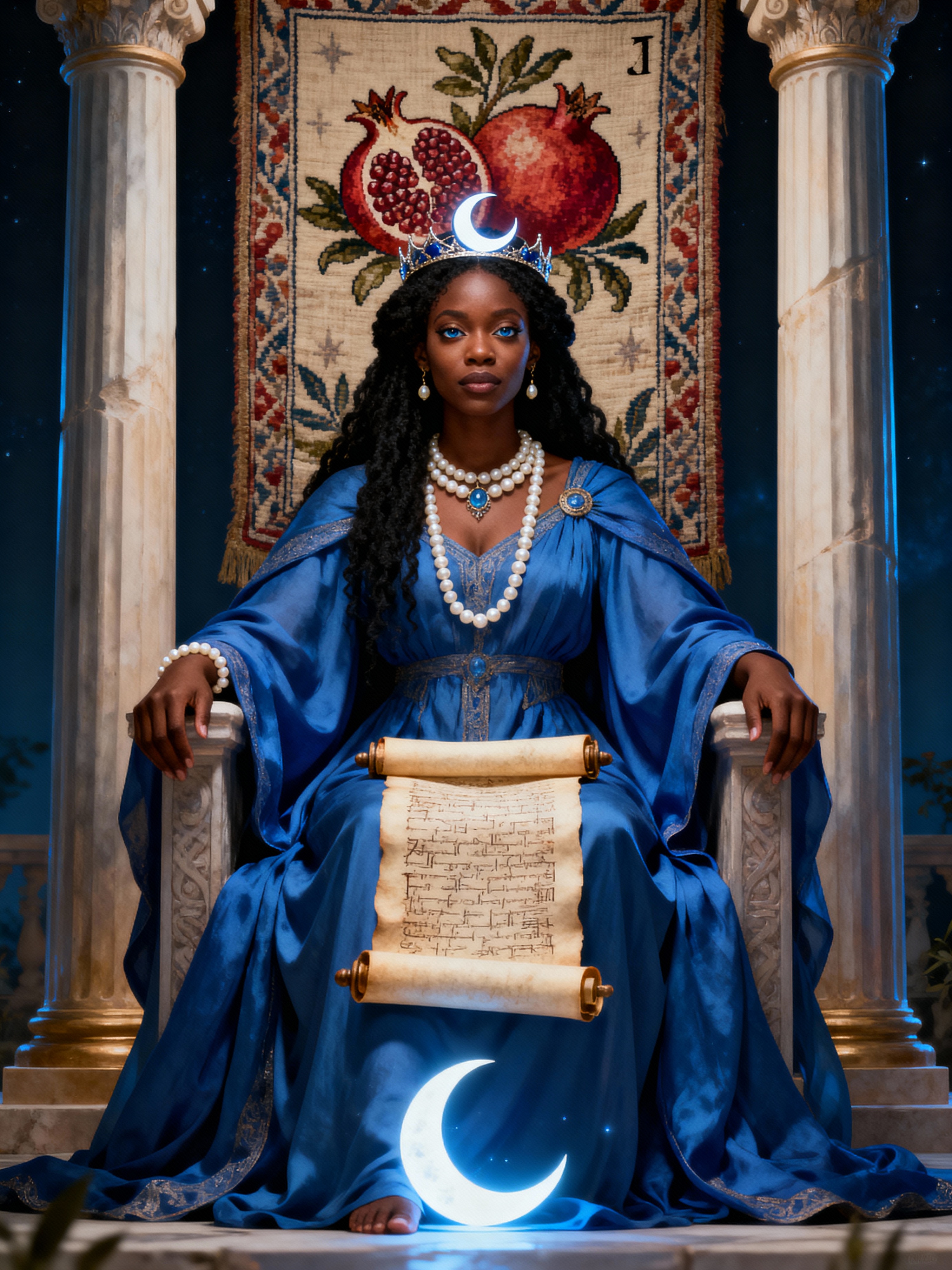 Tarot Card of The High Priestess featuring model wearing flowing blue robes with crescent moon crown and pearl jewelry , seated between two pillars, scroll of ancient wisdom in lap, pomegranate tapestry behind, crescent moon at feet, serene mystical expression