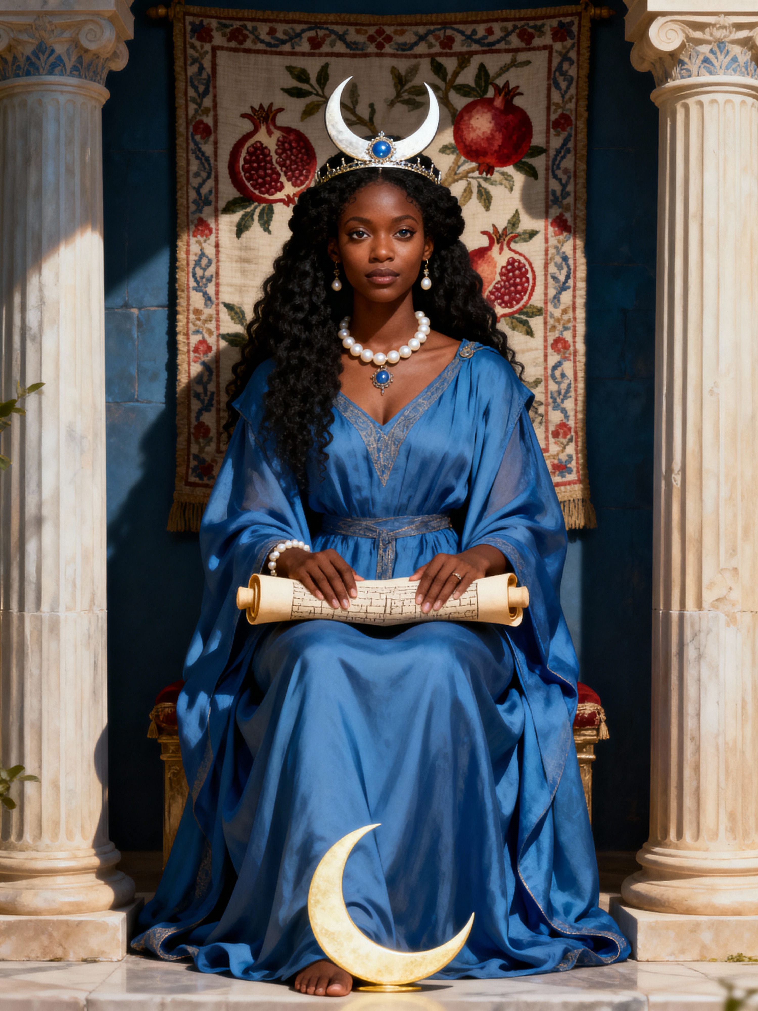 Tarot Card of The High Priestess featuring model wearing flowing blue robes with crescent moon crown and pearl jewelry , seated between two pillars, scroll of ancient wisdom in lap, pomegranate tapestry behind, crescent moon at feet, serene mystical expression