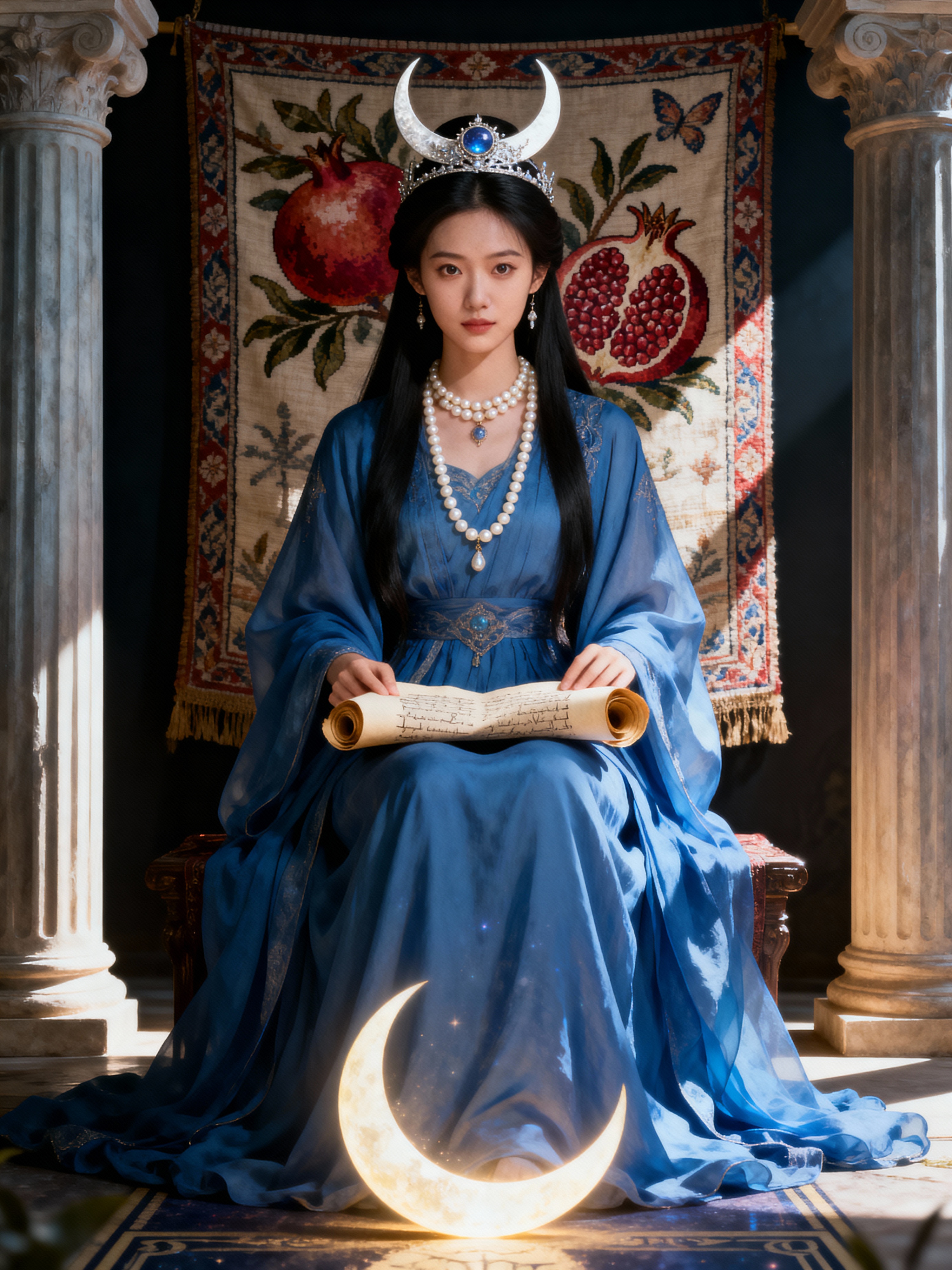 Tarot Card of The High Priestess featuring model wearing flowing blue robes with crescent moon crown and pearl jewelry , seated between two pillars, scroll of ancient wisdom in lap, pomegranate tapestry behind, crescent moon at feet, serene mystical expression