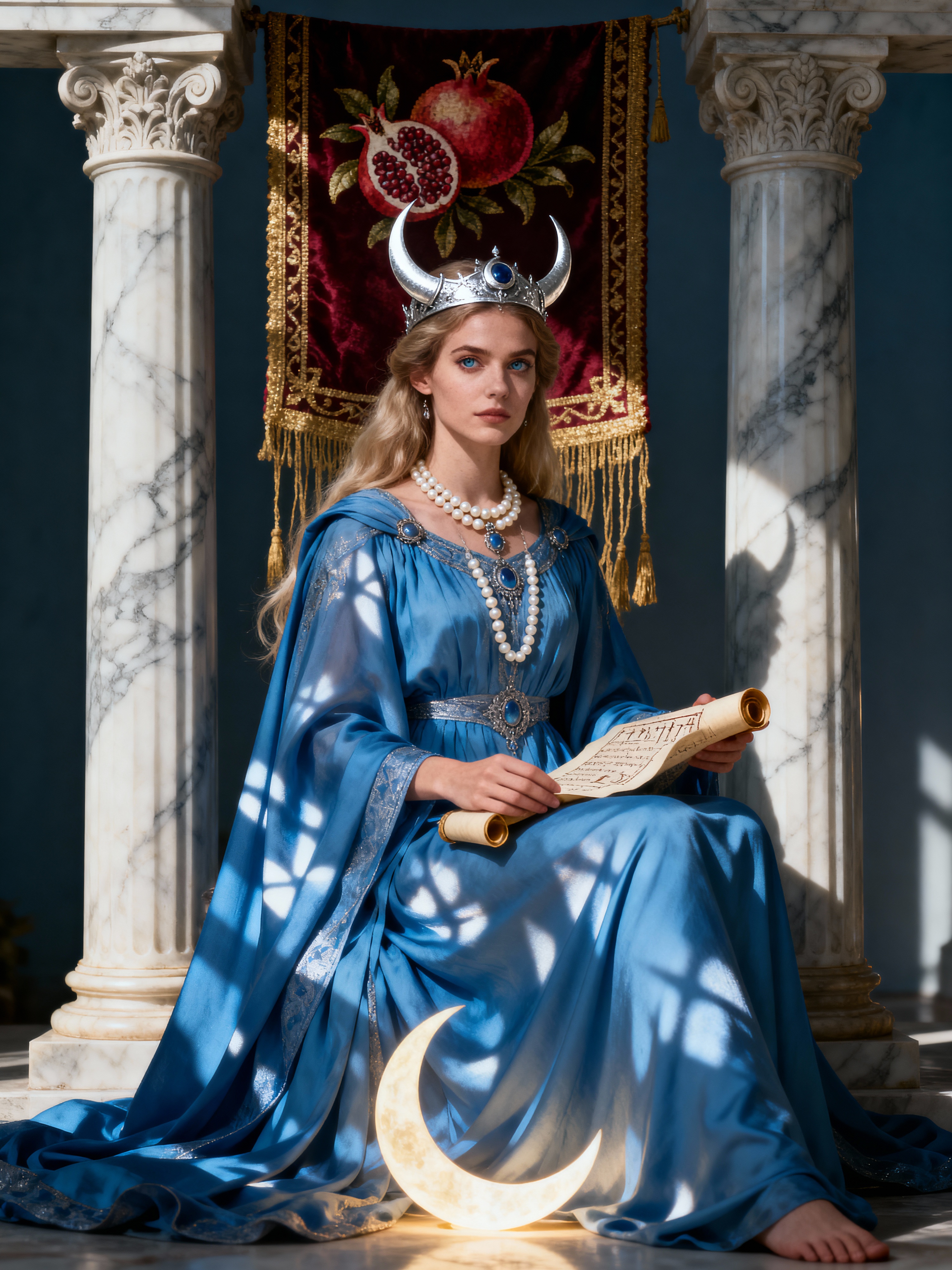 Tarot Card of The High Priestess featuring model wearing flowing blue robes with crescent moon crown and pearl jewelry , seated between two pillars, scroll of ancient wisdom in lap, pomegranate tapestry behind, crescent moon at feet, serene mystical expression