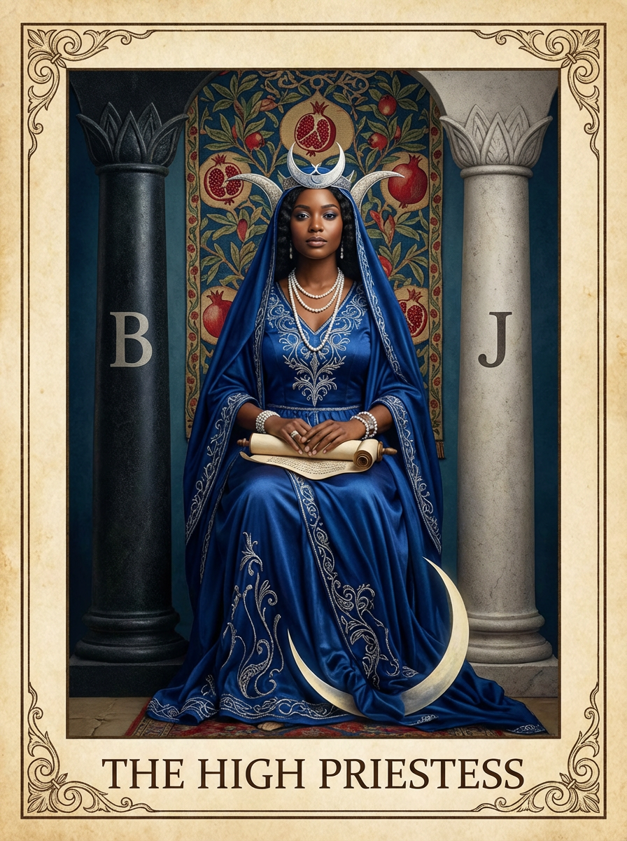 Tarot Card of The High Priestess featuring model wearing flowing blue robes with crescent moon crown and pearl jewelry , seated between two pillars, scroll of ancient wisdom in lap, pomegranate tapestry behind, crescent moon at feet, serene mystical expression