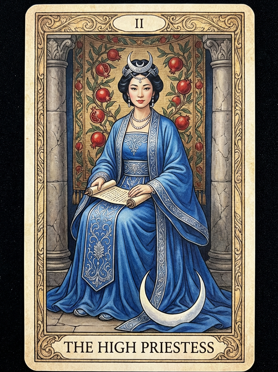 Tarot Card of The High Priestess featuring model wearing flowing blue robes with crescent moon crown and pearl jewelry , seated between two pillars, scroll of ancient wisdom in lap, pomegranate tapestry behind, crescent moon at feet, serene mystical expression