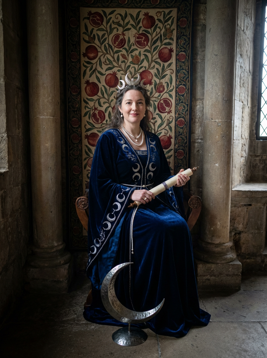 Tarot Card of The High Priestess featuring model wearing flowing blue robes with crescent moon crown and pearl jewelry , seated between two pillars, scroll of ancient wisdom in lap, pomegranate tapestry behind, crescent moon at feet, serene mystical expression