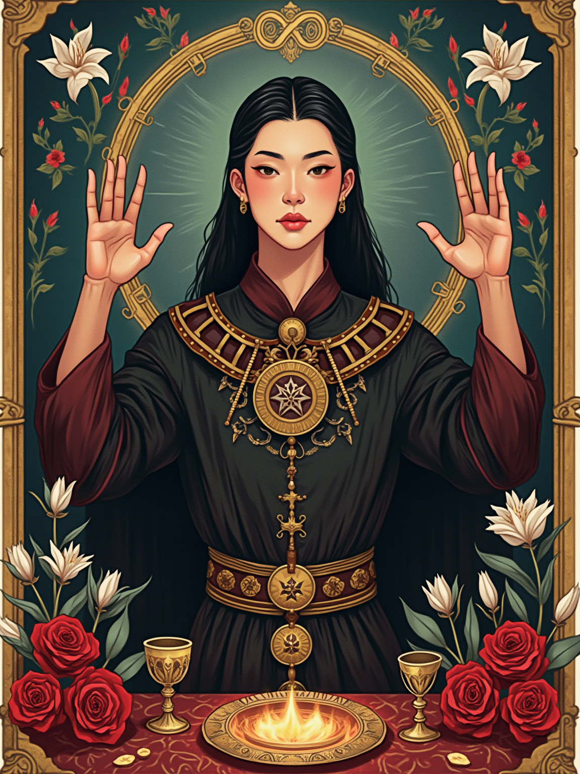 Tarot Card of The Magician featuring model wearing dark ceremonial robes with mystical symbols and amulets, one hand pointing to sky and one to earth, altar table with wand, cup, sword, and pentacle, infinity symbol above head, red roses and white lilies background, powerful expression