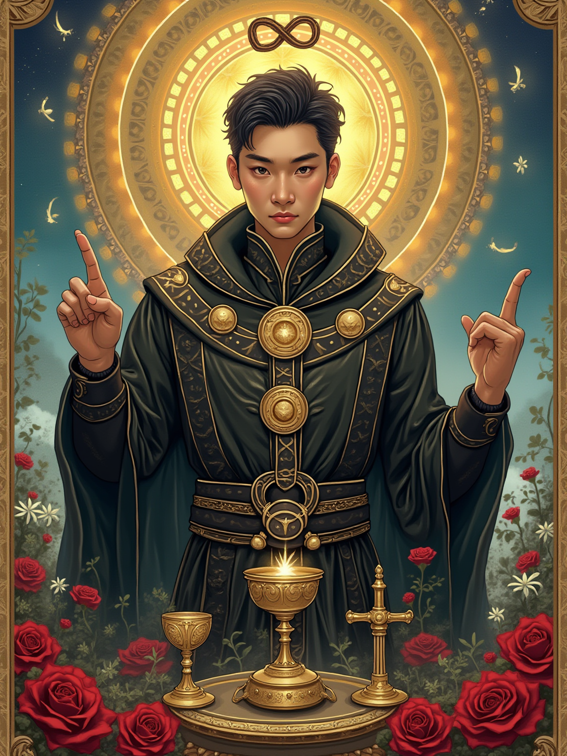 Tarot Card of The Magician featuring model wearing dark ceremonial robes with mystical symbols and amulets, one hand pointing to sky and one to earth, altar table with wand, cup, sword, and pentacle, infinity symbol above head, red roses and white lilies background, powerful expression