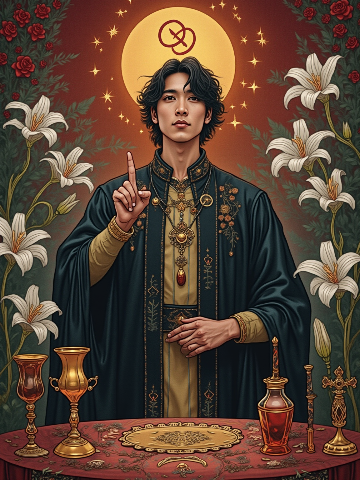 Tarot Card of The Magician featuring model wearing dark ceremonial robes with mystical symbols and amulets, one hand pointing to sky and one to earth, altar table with wand, cup, sword, and pentacle, infinity symbol above head, red roses and white lilies background, powerful expression