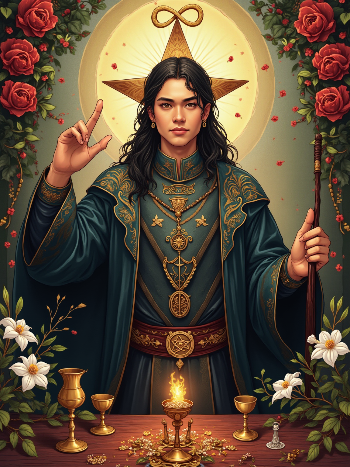 Tarot Card of The Magician featuring model wearing dark ceremonial robes with mystical symbols and amulets, one hand pointing to sky and one to earth, altar table with wand, cup, sword, and pentacle, infinity symbol above head, red roses and white lilies background, powerful expression
