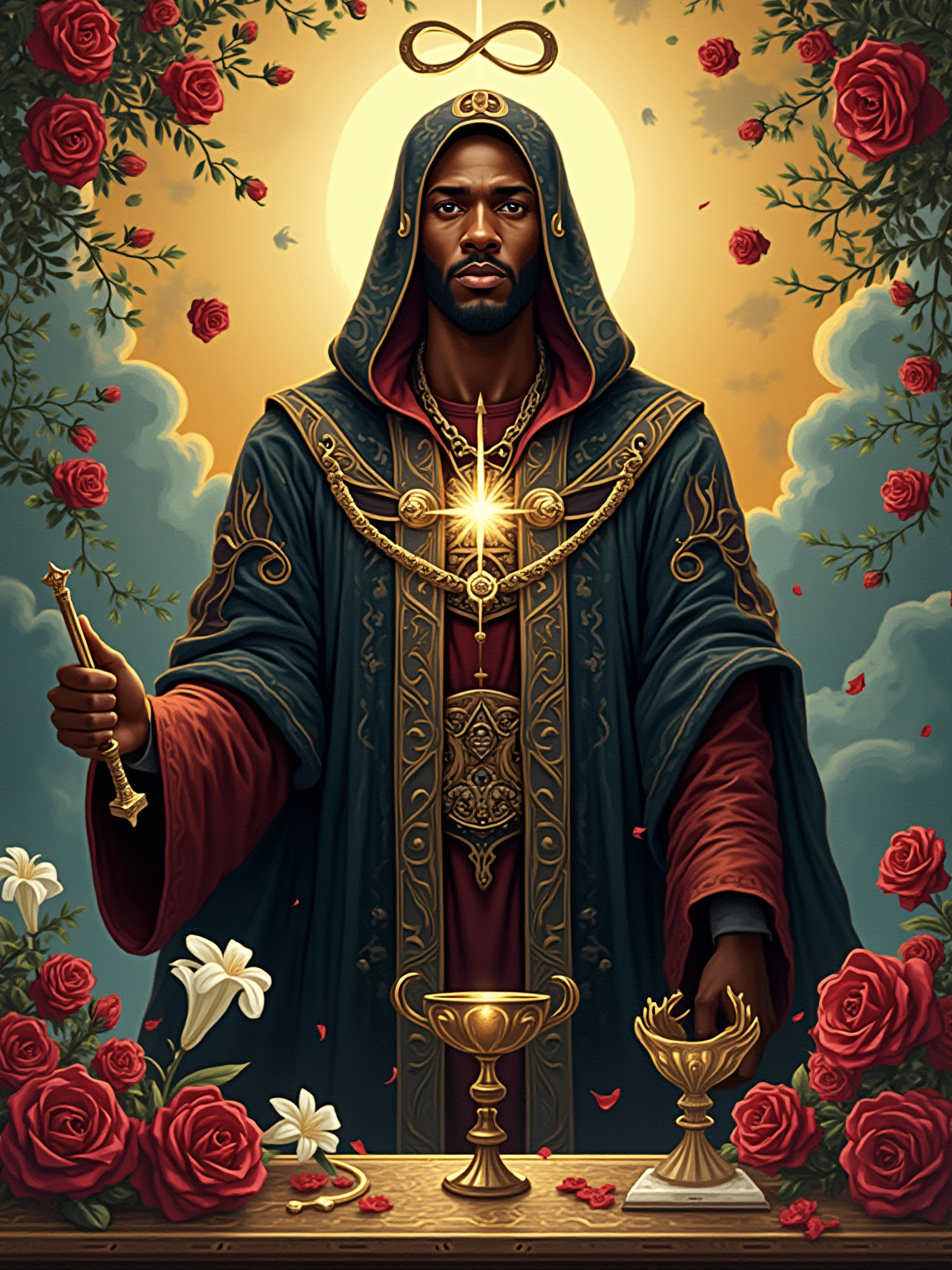 Tarot Card of The Magician featuring model wearing dark ceremonial robes with mystical symbols and amulets, one hand pointing to sky and one to earth, altar table with wand, cup, sword, and pentacle, infinity symbol above head, red roses and white lilies background, powerful expression
