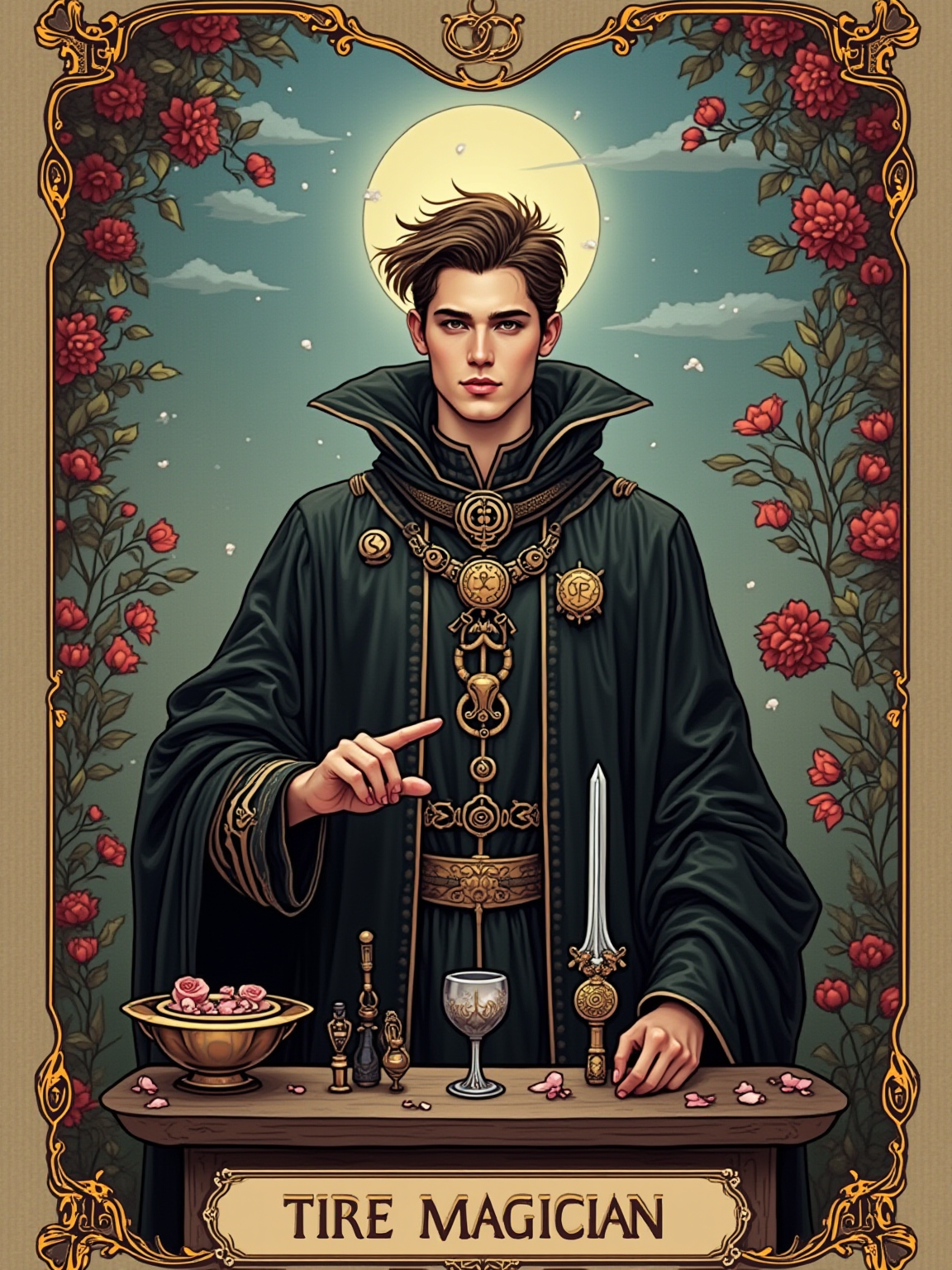 Tarot Card of The Magician featuring model wearing dark ceremonial robes with mystical symbols and amulets, one hand pointing to sky and one to earth, altar table with wand, cup, sword, and pentacle, infinity symbol above head, red roses and white lilies background, powerful expression