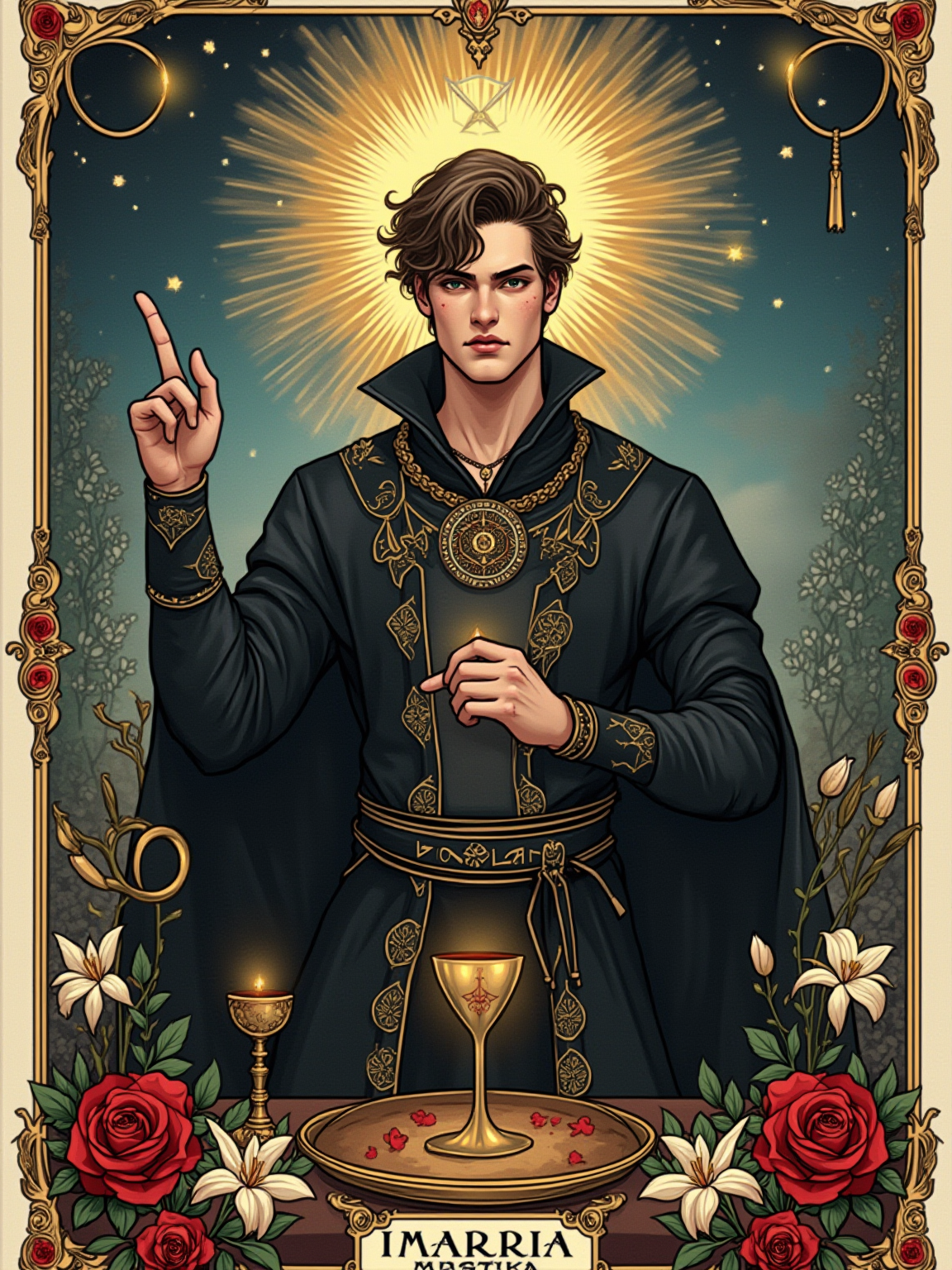 Tarot Card of The Magician featuring model wearing dark ceremonial robes with mystical symbols and amulets, one hand pointing to sky and one to earth, altar table with wand, cup, sword, and pentacle, infinity symbol above head, red roses and white lilies background, powerful expression
