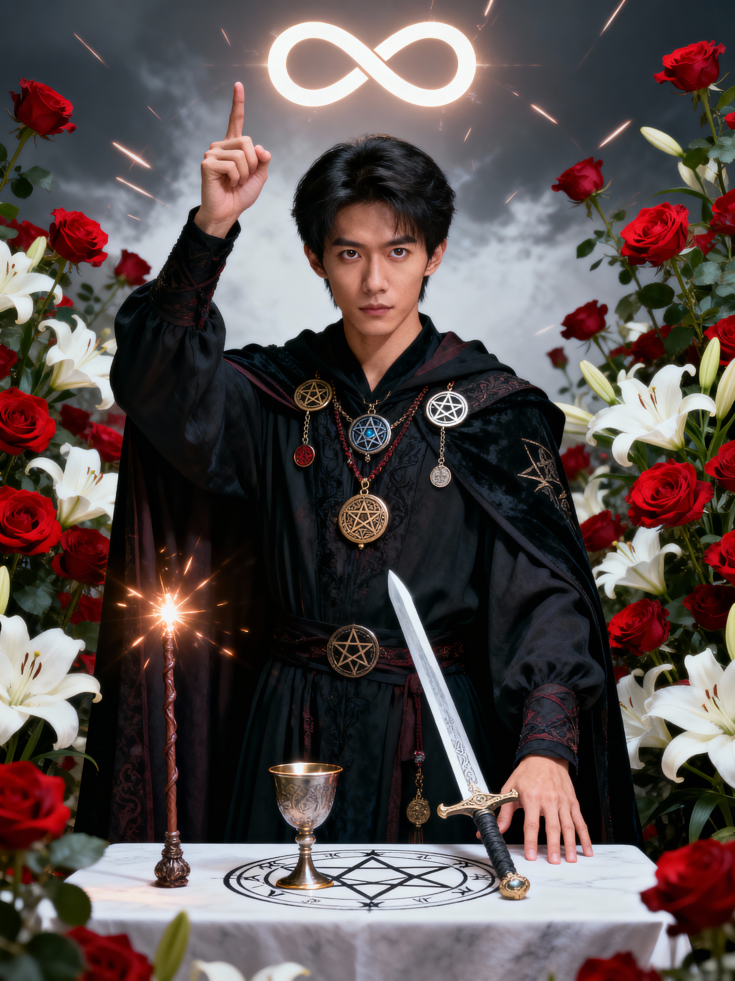 Tarot Card of The Magician featuring model wearing dark ceremonial robes with mystical symbols and amulets, one hand pointing to sky and one to earth, altar table with wand, cup, sword, and pentacle, infinity symbol above head, red roses and white lilies background, powerful expression