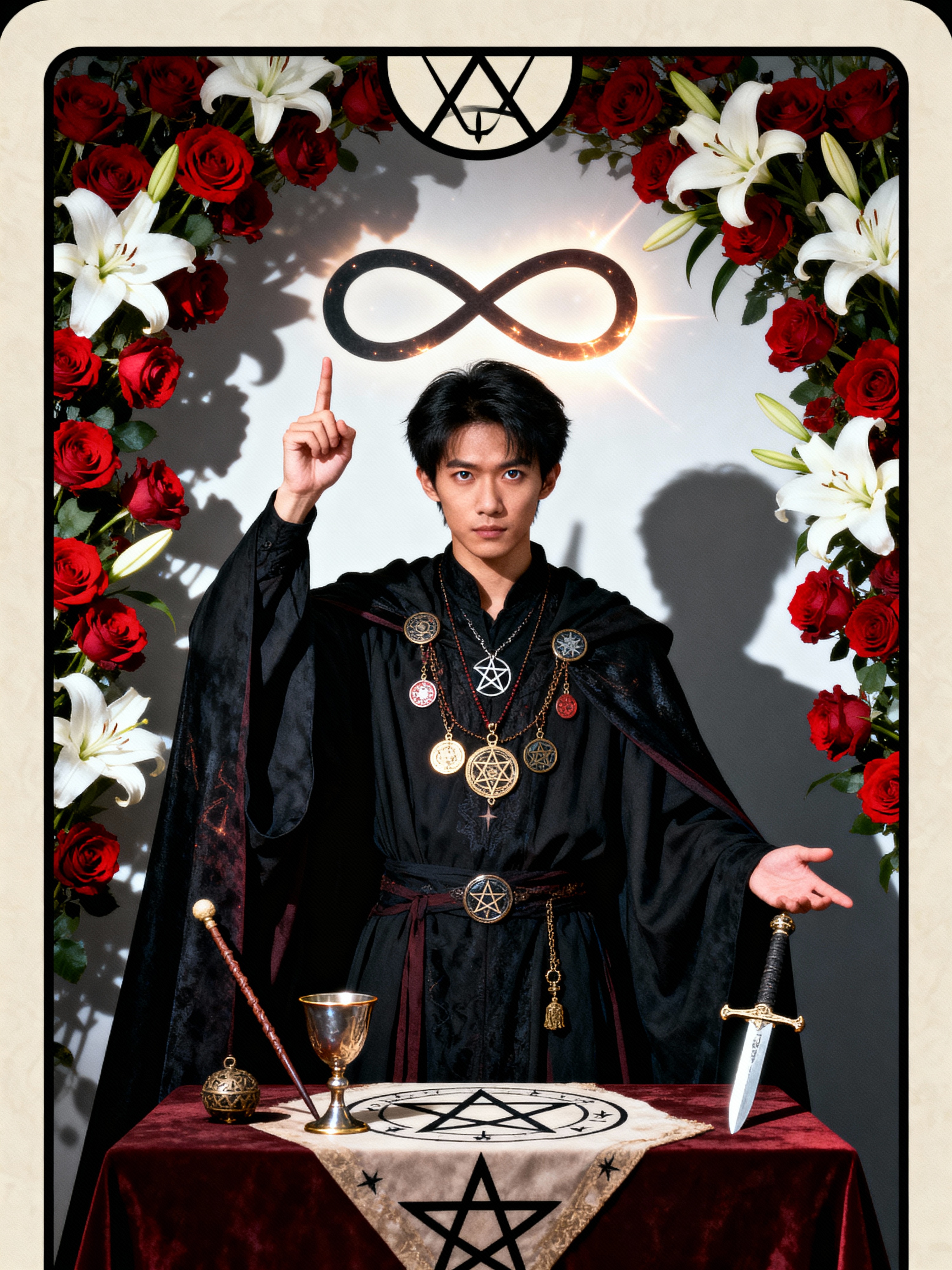 Tarot Card of The Magician featuring model wearing dark ceremonial robes with mystical symbols and amulets, one hand pointing to sky and one to earth, altar table with wand, cup, sword, and pentacle, infinity symbol above head, red roses and white lilies background, powerful expression