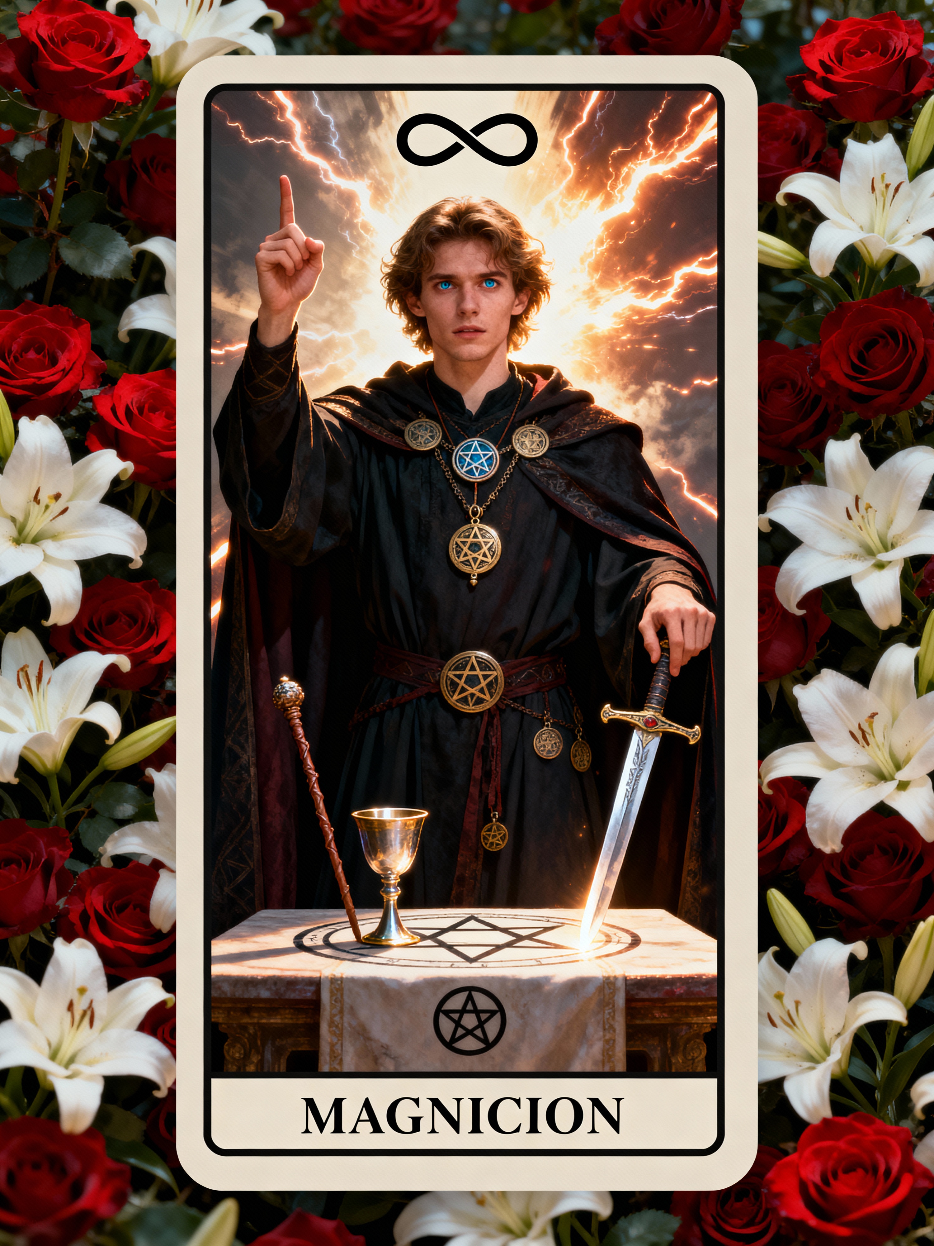 Tarot Card of The Magician featuring model wearing dark ceremonial robes with mystical symbols and amulets, one hand pointing to sky and one to earth, altar table with wand, cup, sword, and pentacle, infinity symbol above head, red roses and white lilies background, powerful expression