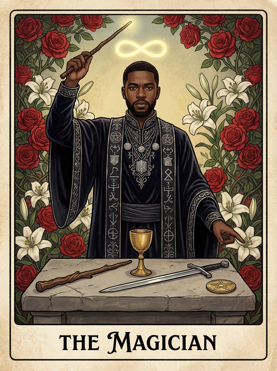 Tarot Card of The Magician featuring model wearing dark ceremonial robes with mystical symbols and amulets, one hand pointing to sky and one to earth, altar table with wand, cup, sword, and pentacle, infinity symbol above head, red roses and white lilies background, powerful expression