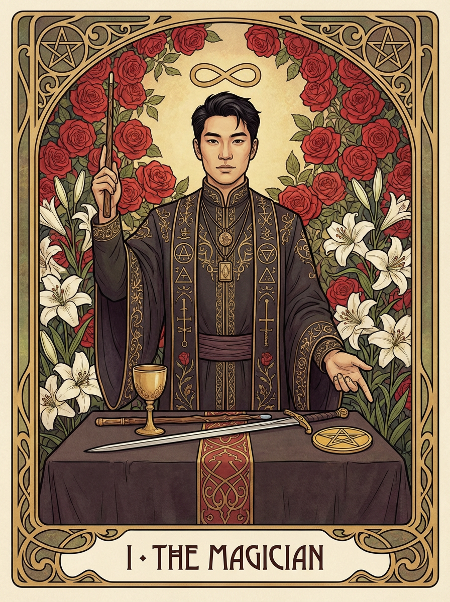 Tarot Card of The Magician featuring model wearing dark ceremonial robes with mystical symbols and amulets, one hand pointing to sky and one to earth, altar table with wand, cup, sword, and pentacle, infinity symbol above head, red roses and white lilies background, powerful expression