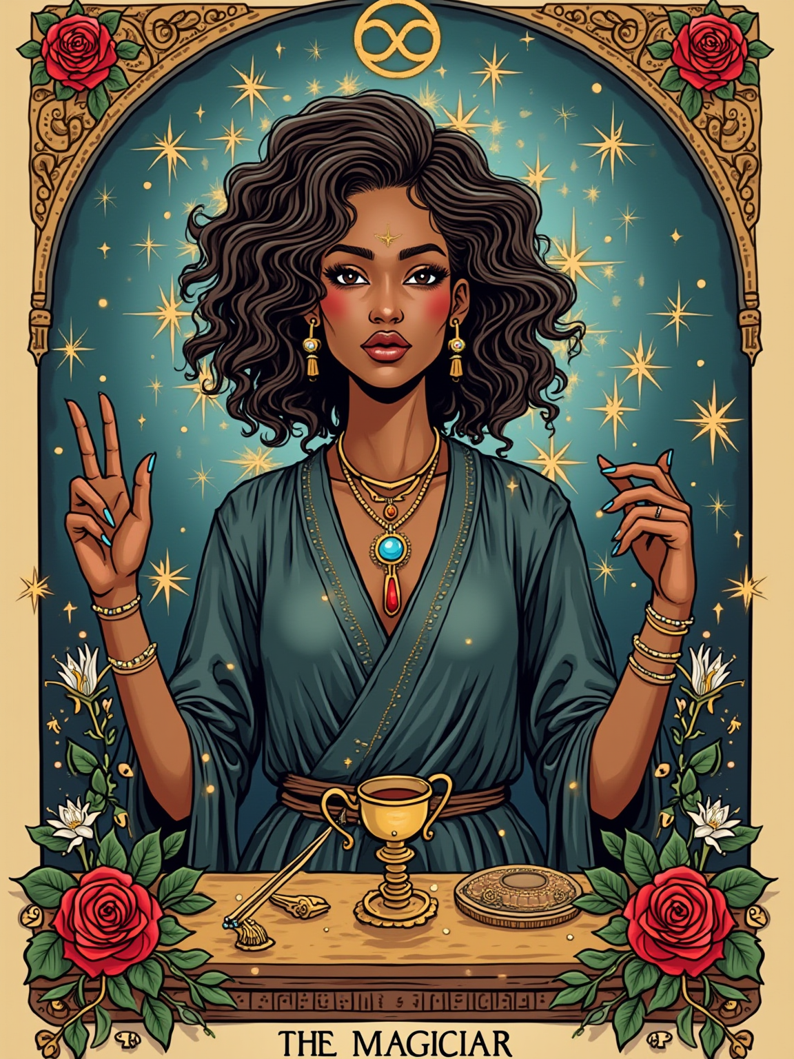 Tarot Card of The Magician featuring model wearing mystical robes with celestial symbols and crystal jewelry , one hand pointing to sky and one to earth, altar table with wand, cup, sword, and pentacle, infinity symbol above head, red roses and white lilies background, powerful expression