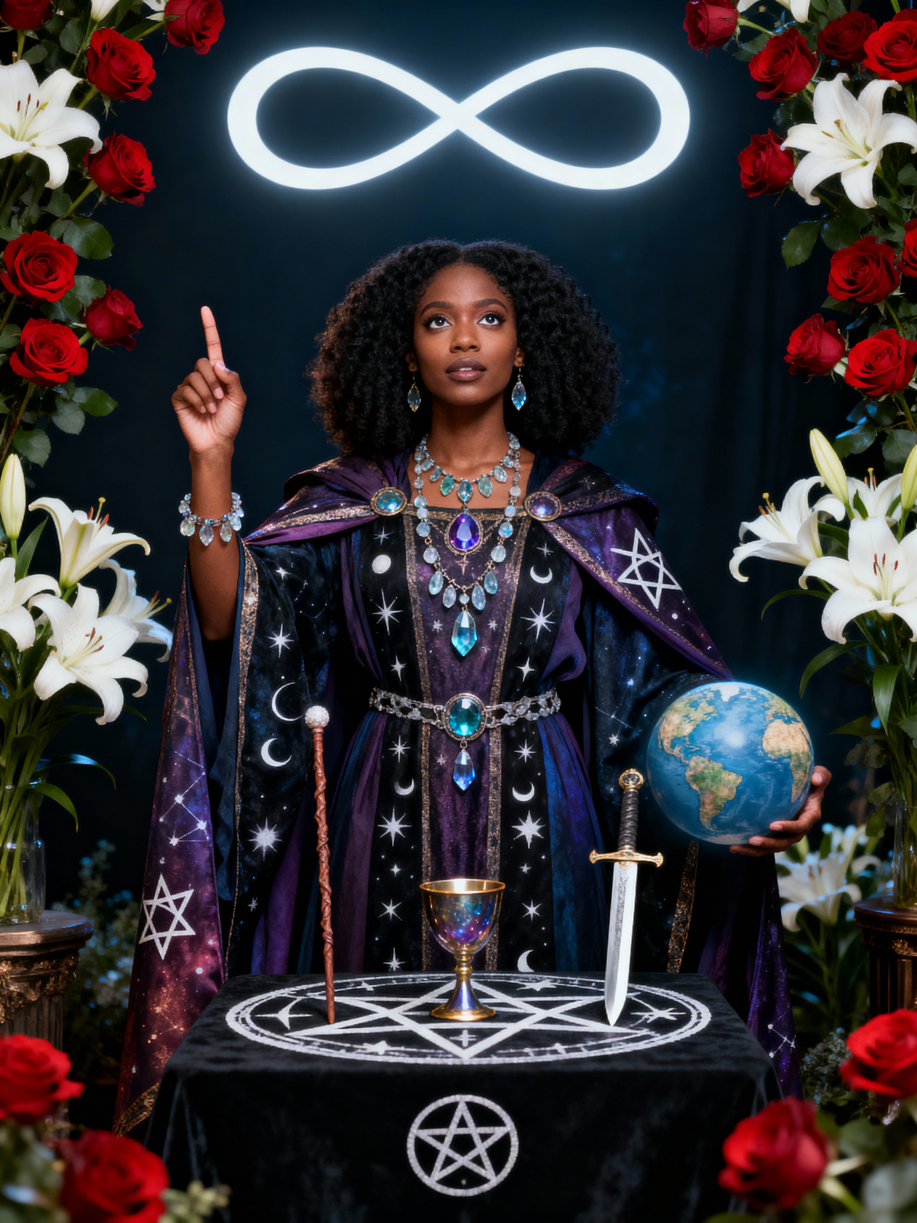 Tarot Card of The Magician featuring model wearing mystical robes with celestial symbols and crystal jewelry , one hand pointing to sky and one to earth, altar table with wand, cup, sword, and pentacle, infinity symbol above head, red roses and white lilies background, powerful expression