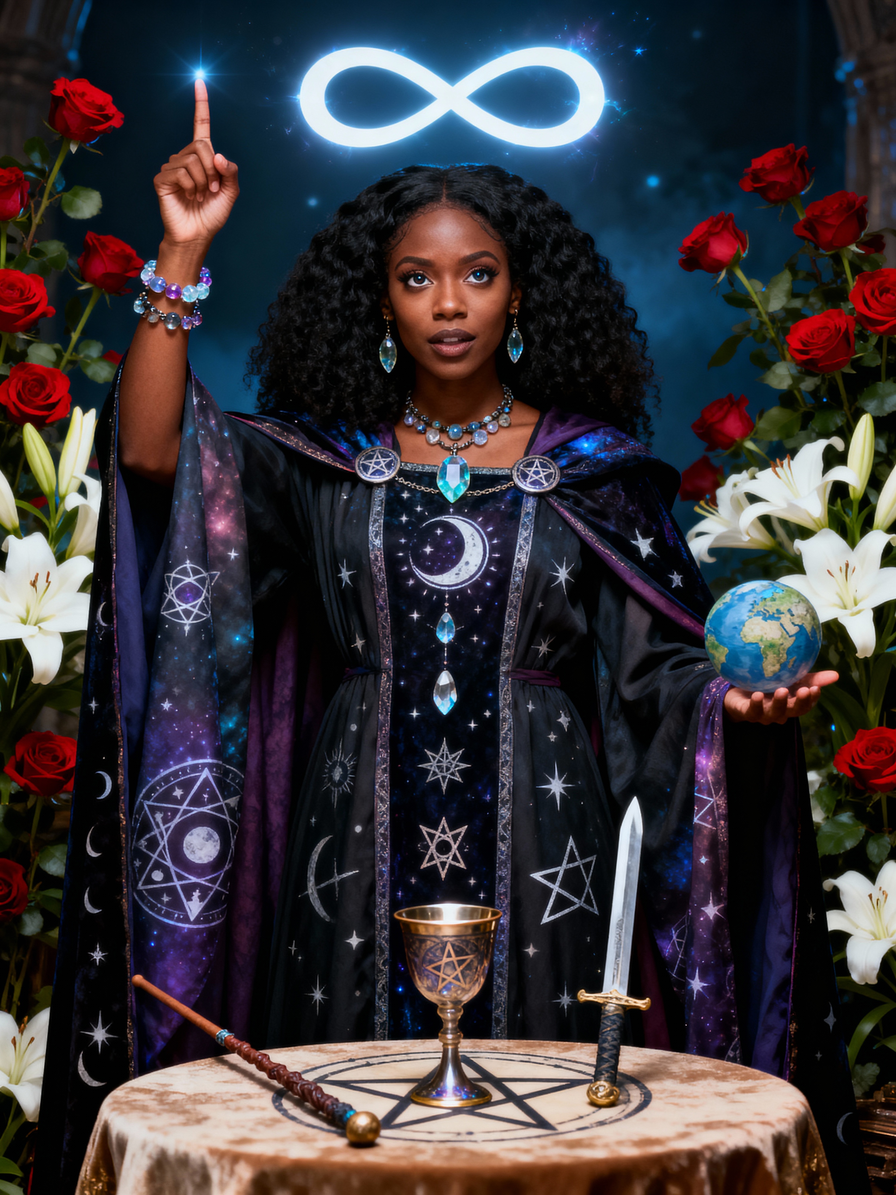 Tarot Card of The Magician featuring model wearing mystical robes with celestial symbols and crystal jewelry , one hand pointing to sky and one to earth, altar table with wand, cup, sword, and pentacle, infinity symbol above head, red roses and white lilies background, powerful expression