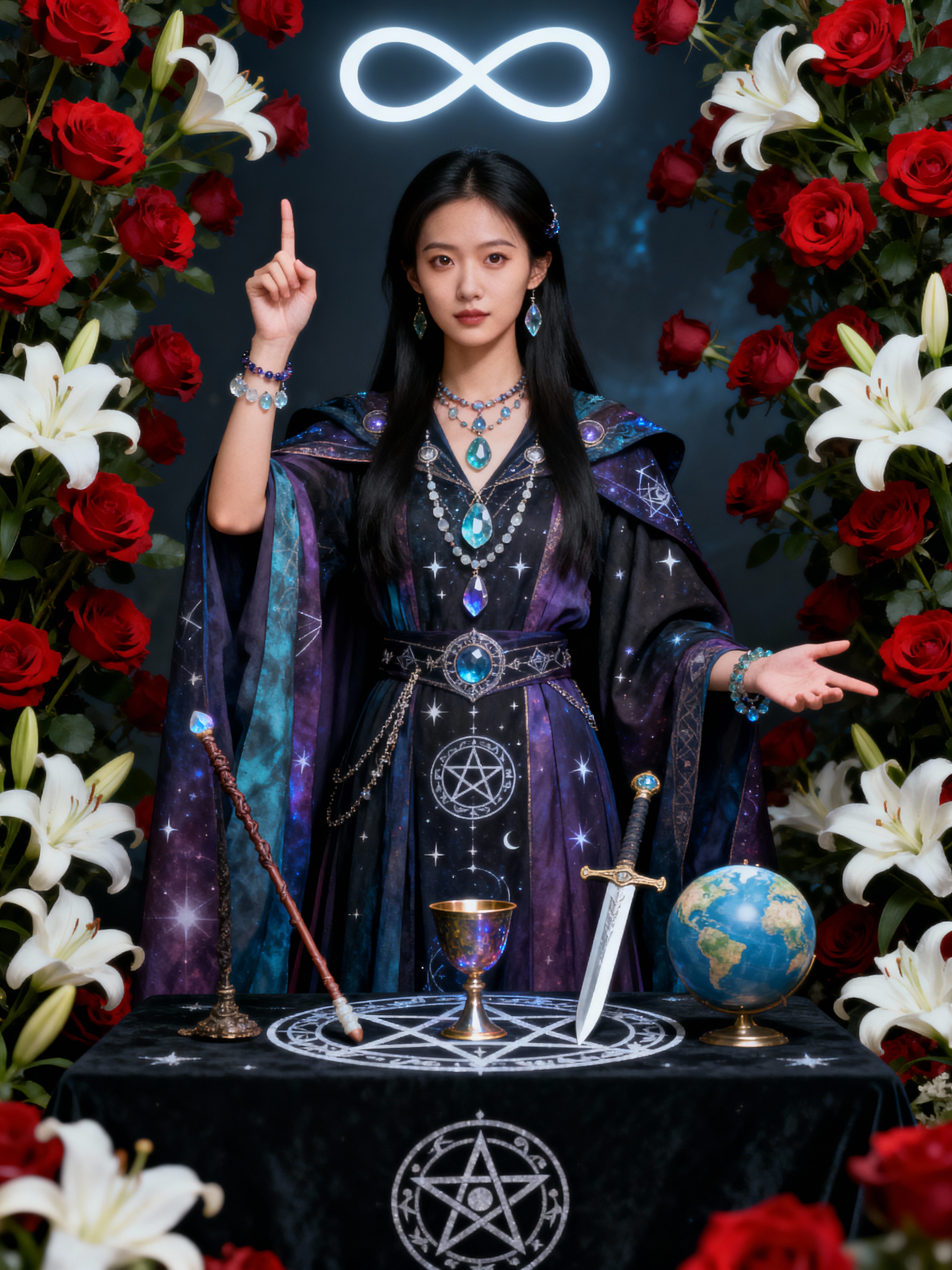 Tarot Card of The Magician featuring model wearing mystical robes with celestial symbols and crystal jewelry , one hand pointing to sky and one to earth, altar table with wand, cup, sword, and pentacle, infinity symbol above head, red roses and white lilies background, powerful expression