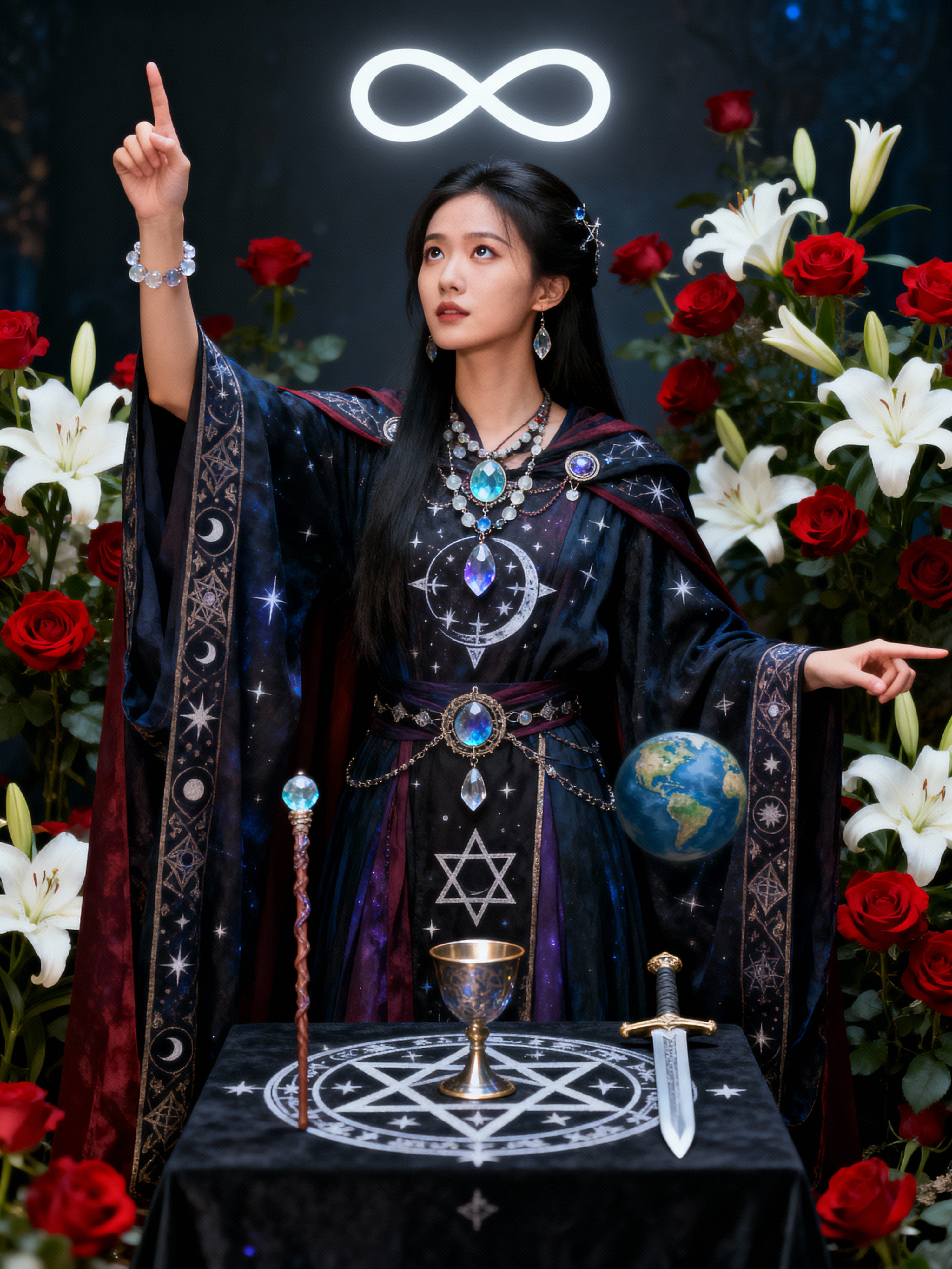 Tarot Card of The Magician featuring model wearing mystical robes with celestial symbols and crystal jewelry , one hand pointing to sky and one to earth, altar table with wand, cup, sword, and pentacle, infinity symbol above head, red roses and white lilies background, powerful expression