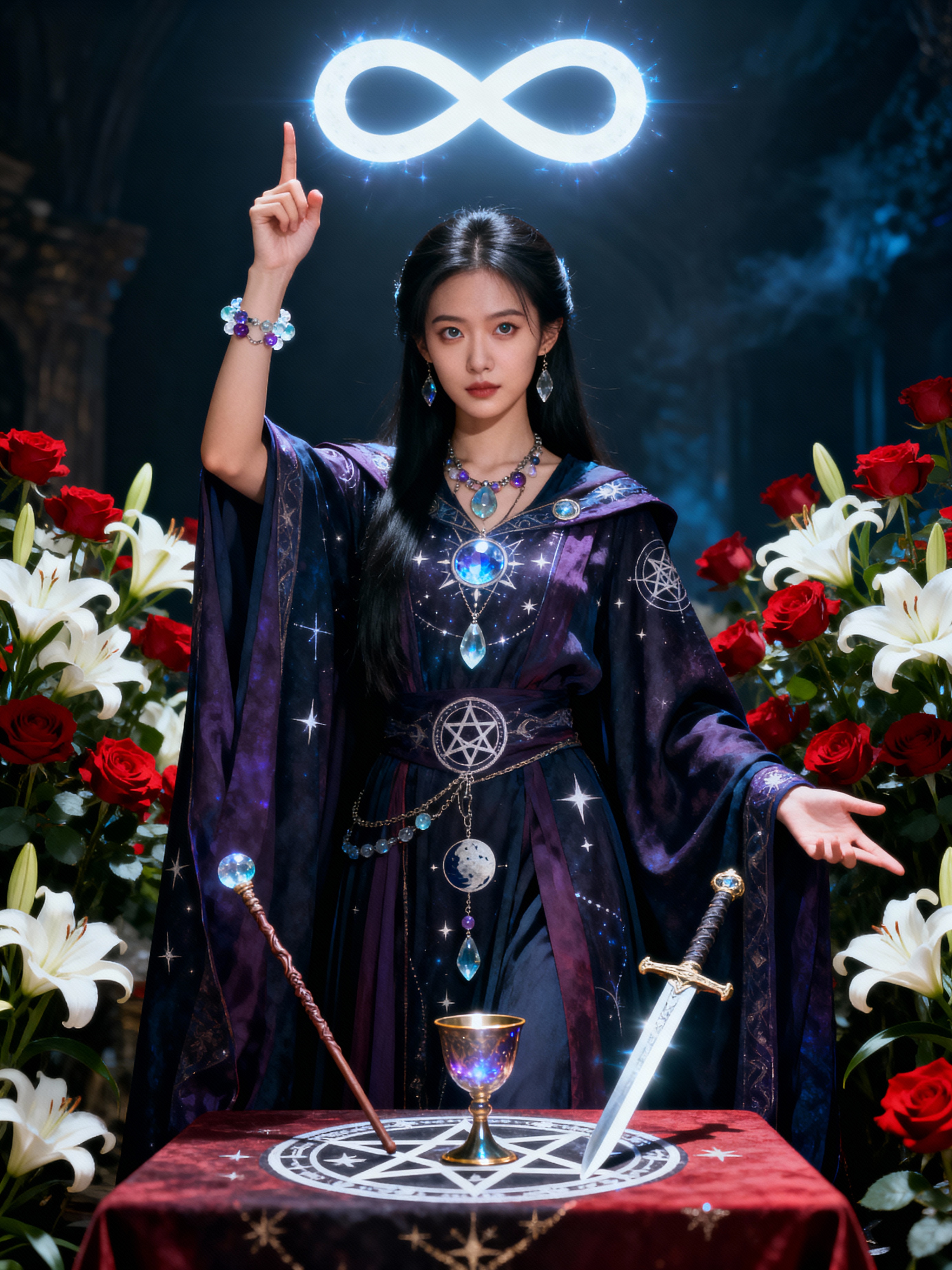 Tarot Card of The Magician featuring model wearing mystical robes with celestial symbols and crystal jewelry , one hand pointing to sky and one to earth, altar table with wand, cup, sword, and pentacle, infinity symbol above head, red roses and white lilies background, powerful expression