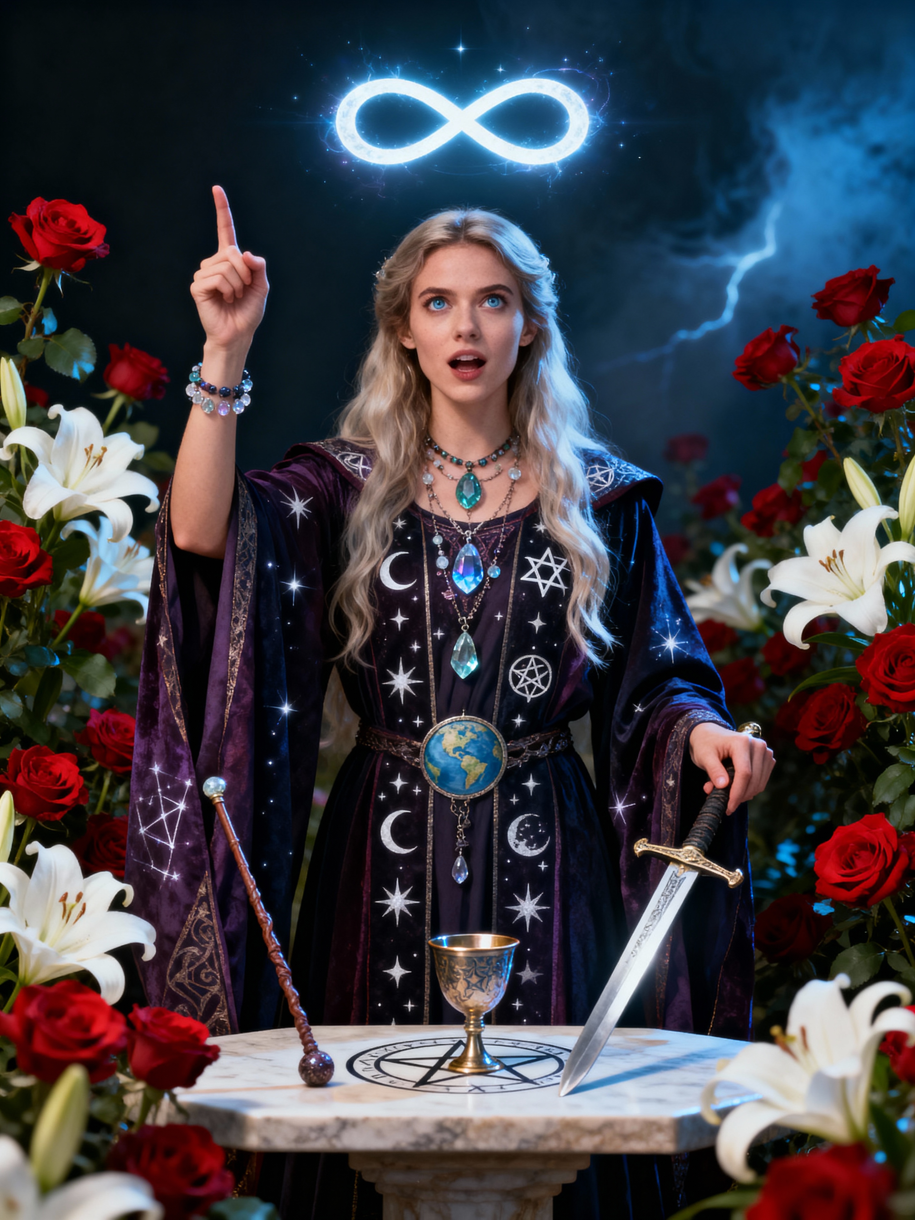 Tarot Card of The Magician featuring model wearing mystical robes with celestial symbols and crystal jewelry , one hand pointing to sky and one to earth, altar table with wand, cup, sword, and pentacle, infinity symbol above head, red roses and white lilies background, powerful expression