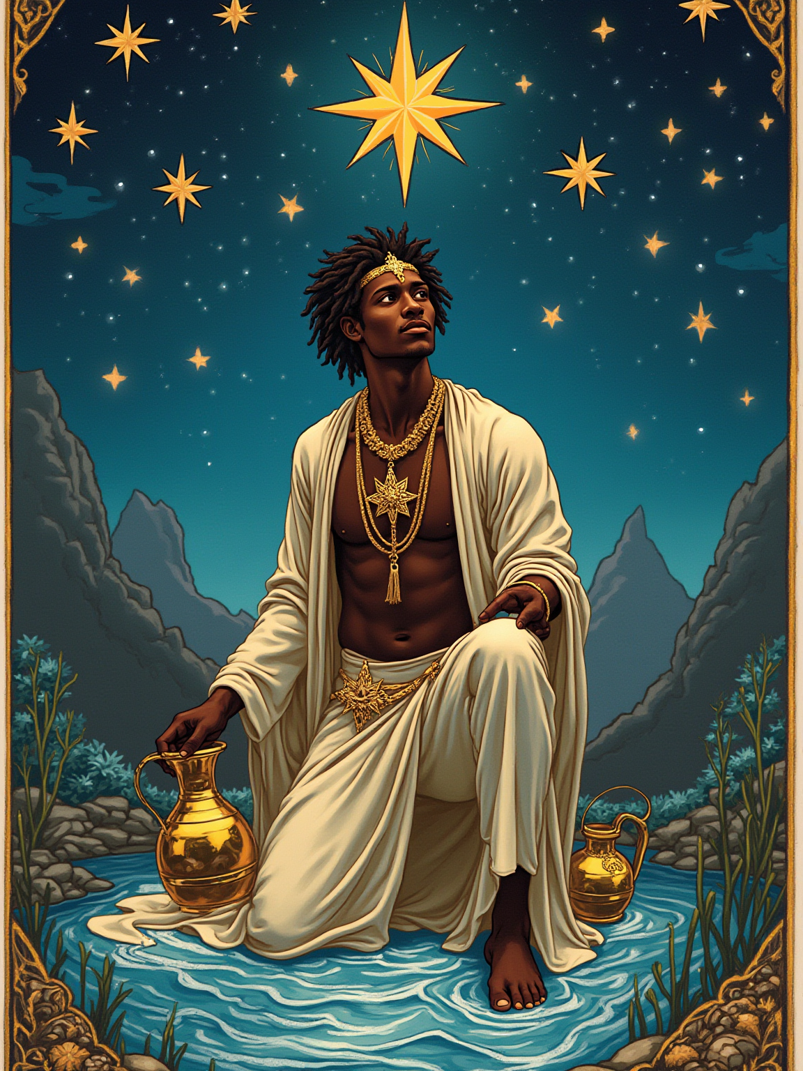 Tarot Card of The Star featuring model wearing celestial robes with star amulets and cosmic headpiece, kneeling by water, pouring water from two jugs, seven stars in night sky above, one large star prominent, hopeful serene expression, mystical landscape