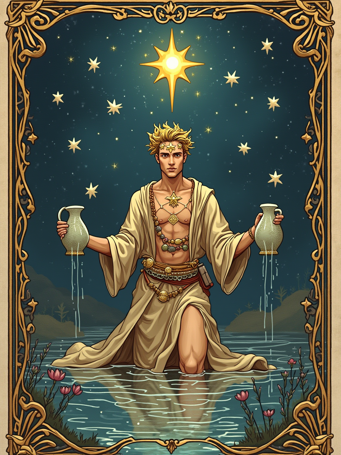 Tarot Card of The Star featuring model wearing celestial robes with star amulets and cosmic headpiece, kneeling by water, pouring water from two jugs, seven stars in night sky above, one large star prominent, hopeful serene expression, mystical landscape