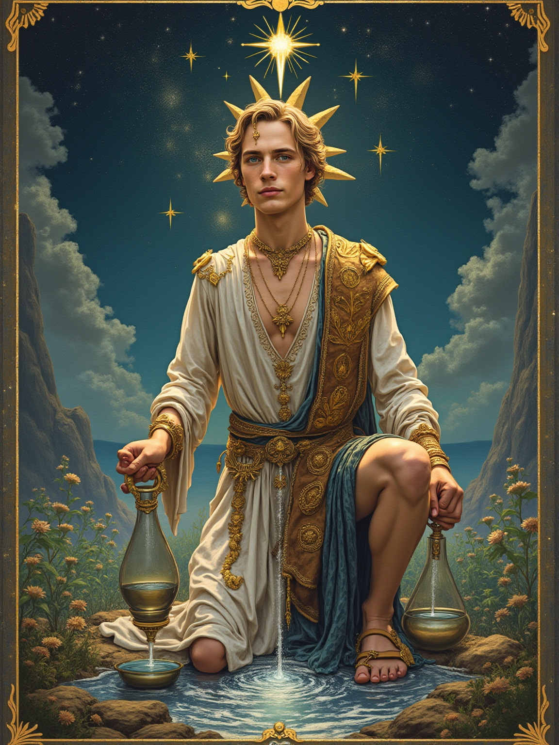 Tarot Card of The Star featuring model wearing celestial robes with star amulets and cosmic headpiece, kneeling by water, pouring water from two jugs, seven stars in night sky above, one large star prominent, hopeful serene expression, mystical landscape