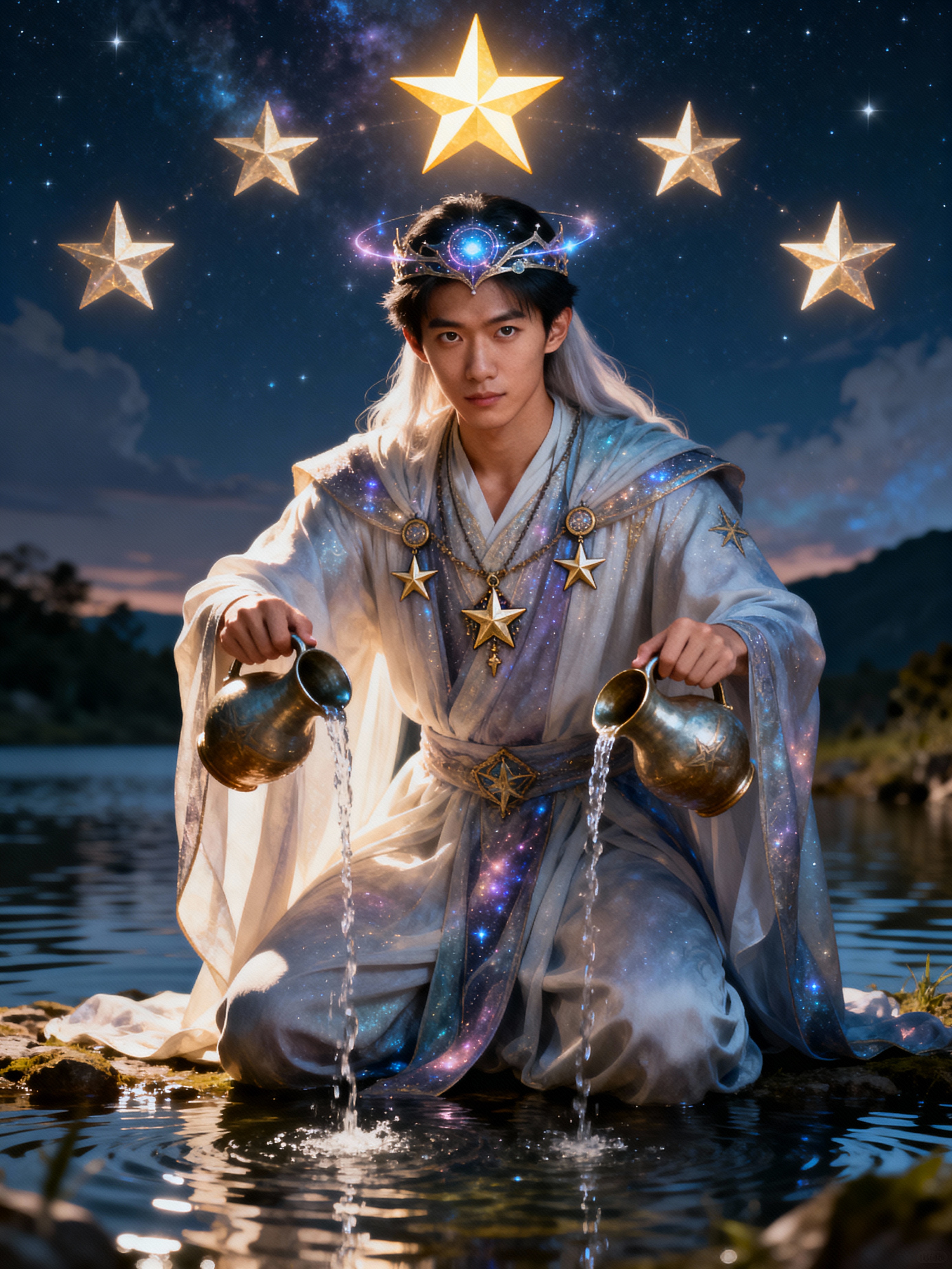 Tarot Card of The Star featuring model wearing celestial robes with star amulets and cosmic headpiece, kneeling by water, pouring water from two jugs, seven stars in night sky above, one large star prominent, hopeful serene expression, mystical landscape