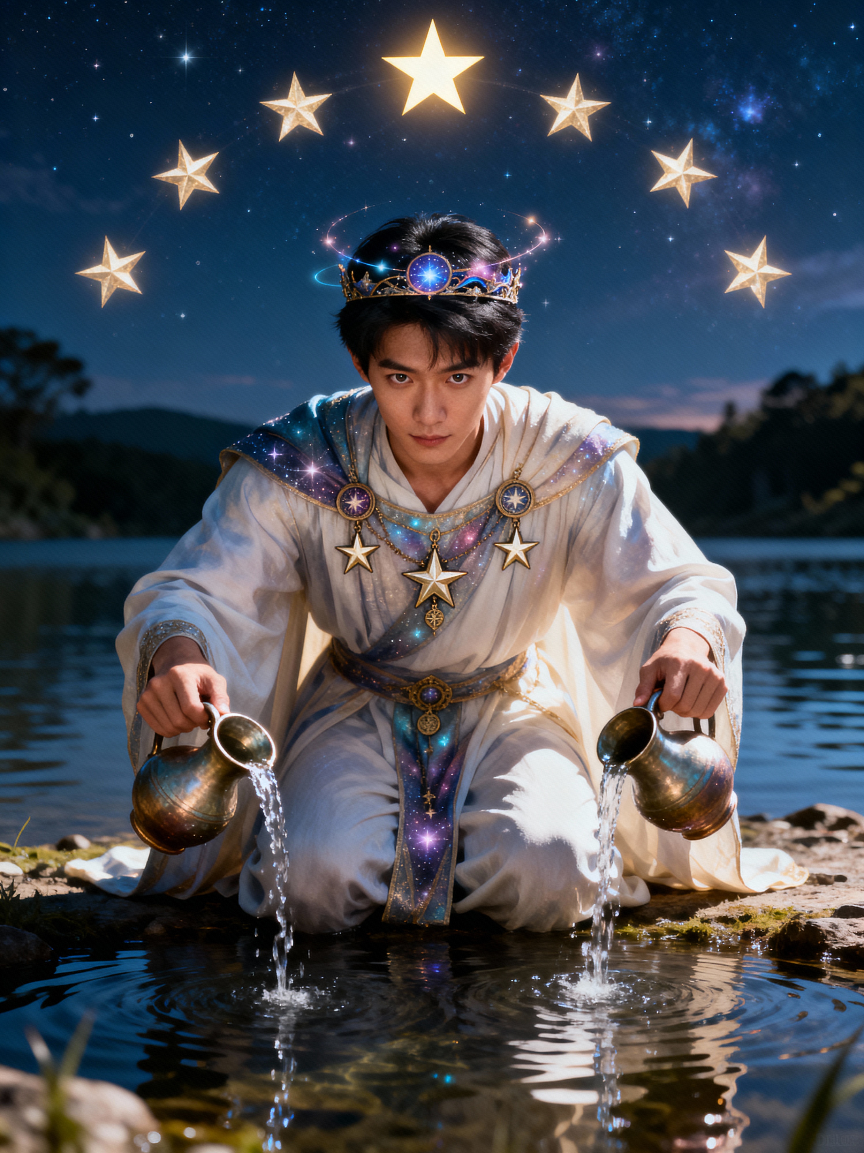 Tarot Card of The Star featuring model wearing celestial robes with star amulets and cosmic headpiece, kneeling by water, pouring water from two jugs, seven stars in night sky above, one large star prominent, hopeful serene expression, mystical landscape