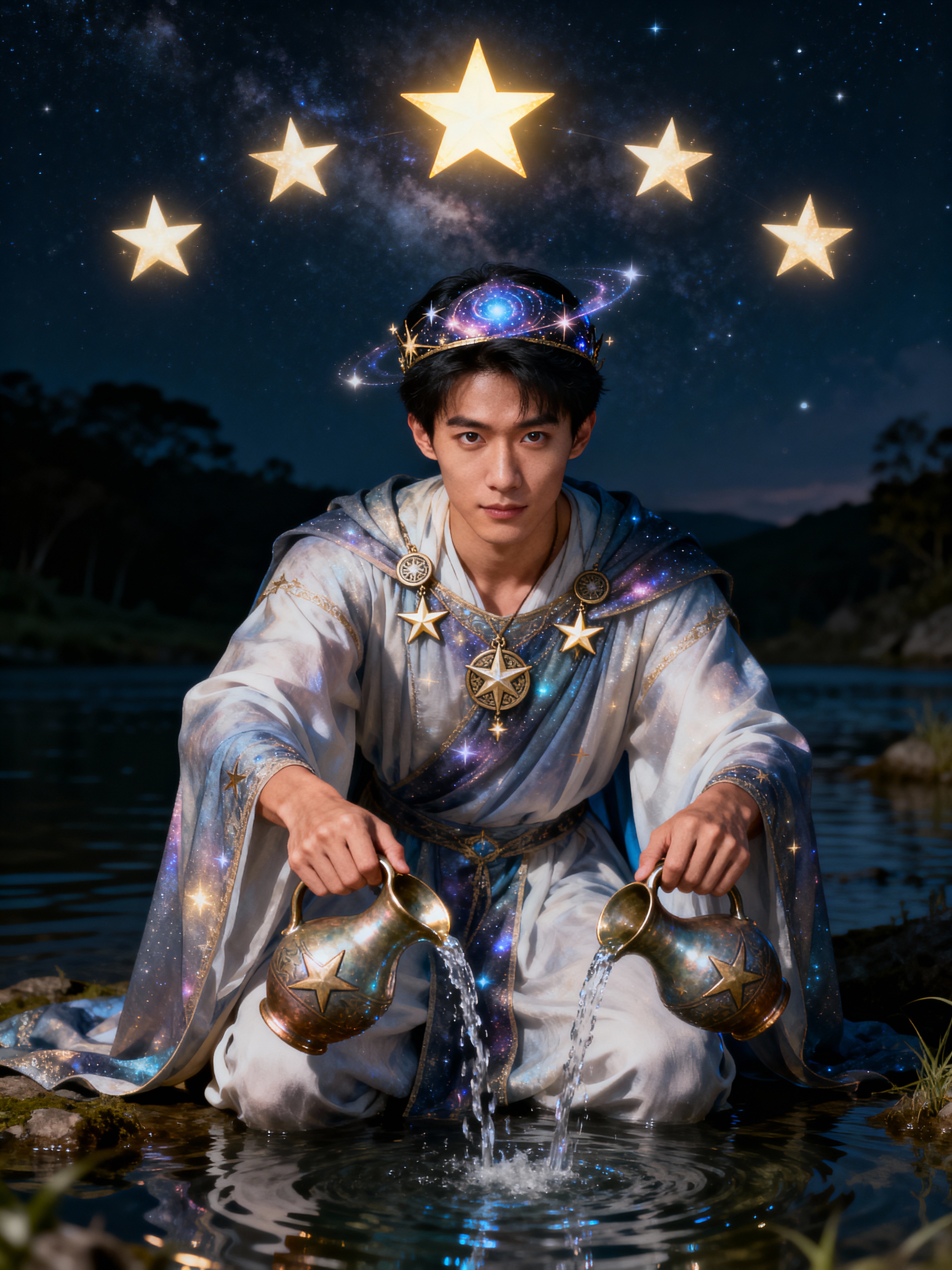 Tarot Card of The Star featuring model wearing celestial robes with star amulets and cosmic headpiece, kneeling by water, pouring water from two jugs, seven stars in night sky above, one large star prominent, hopeful serene expression, mystical landscape