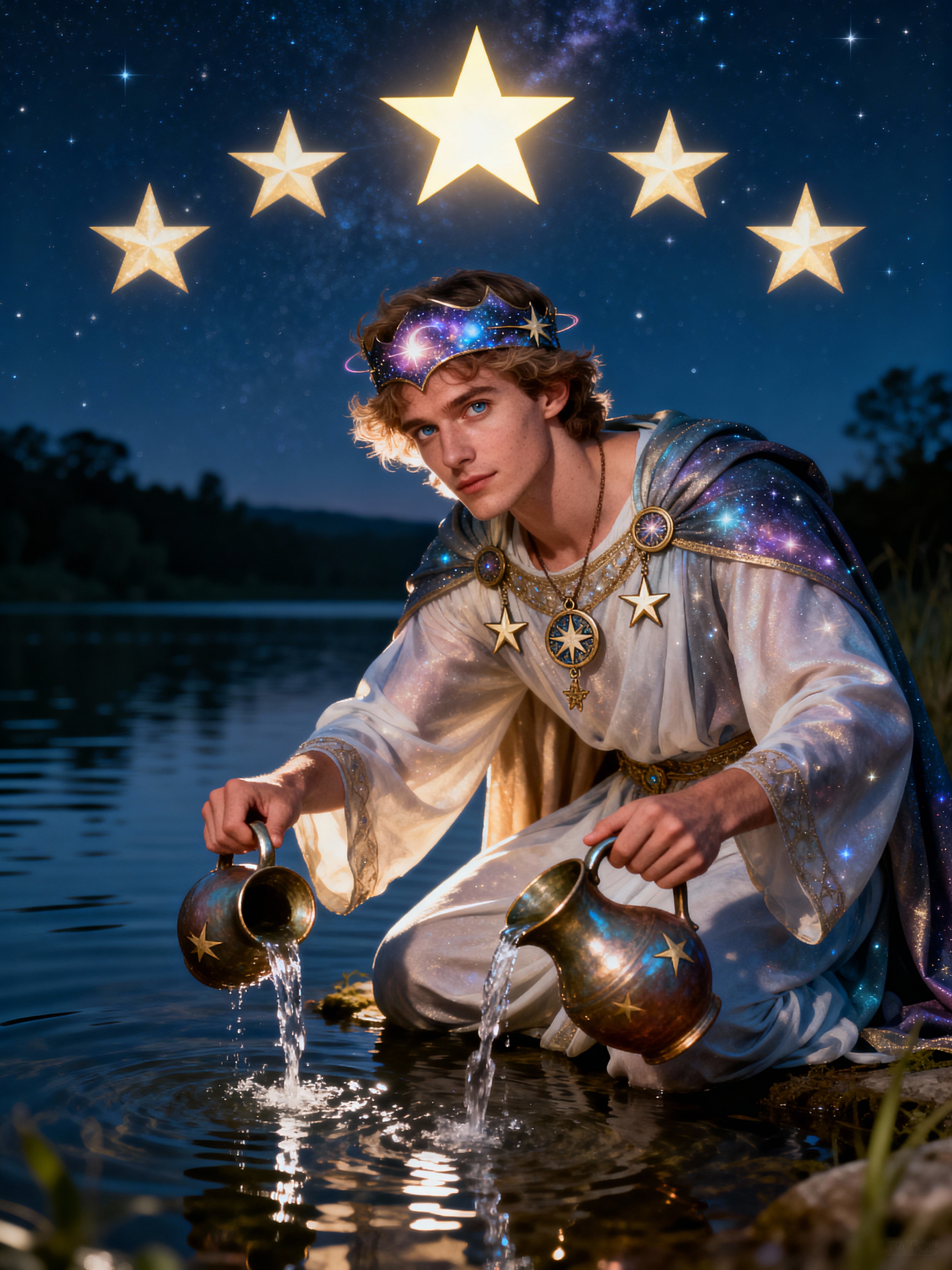 Tarot Card of The Star featuring model wearing celestial robes with star amulets and cosmic headpiece, kneeling by water, pouring water from two jugs, seven stars in night sky above, one large star prominent, hopeful serene expression, mystical landscape