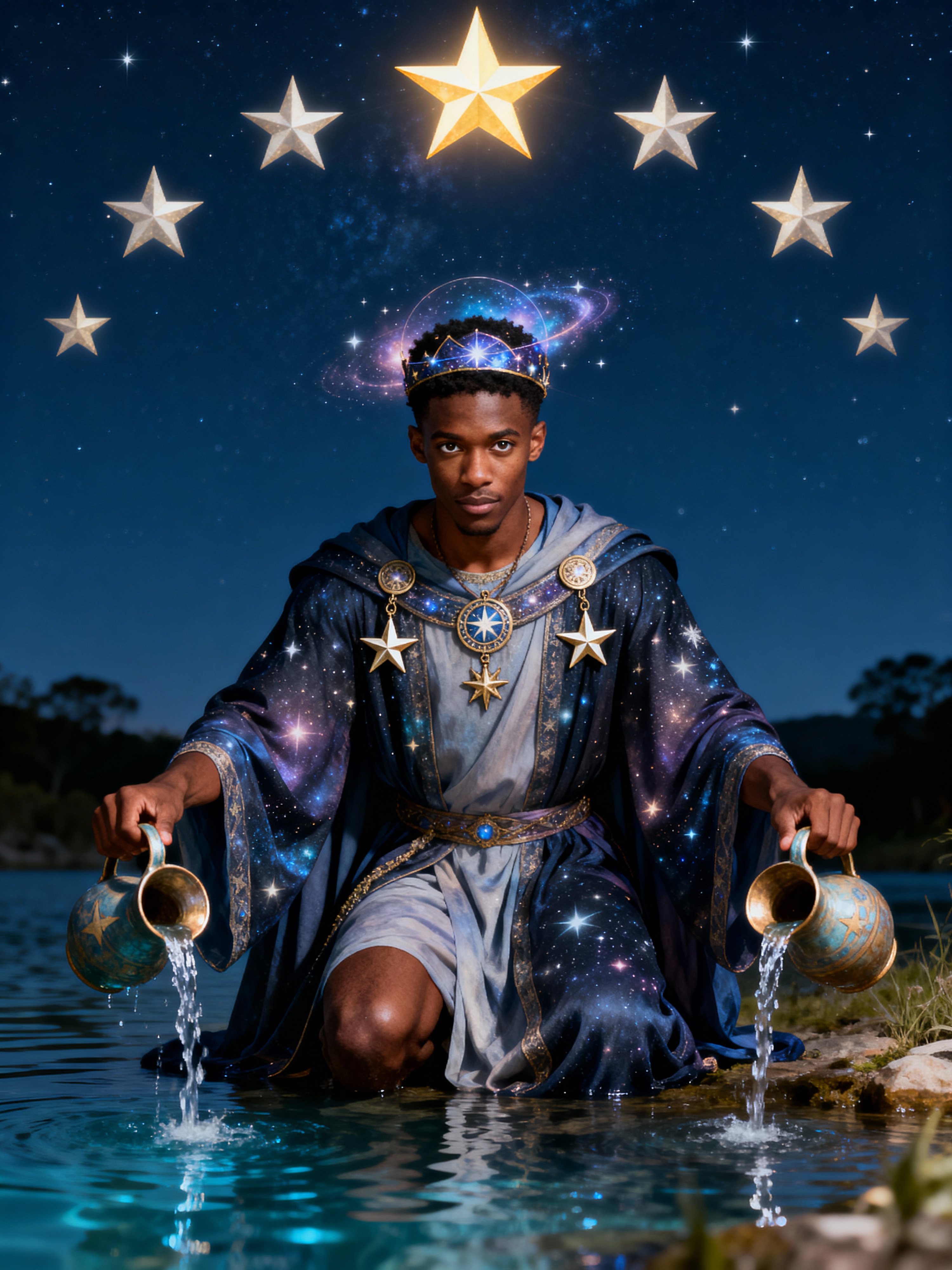 Tarot Card of The Star featuring model wearing celestial robes with star amulets and cosmic headpiece, kneeling by water, pouring water from two jugs, seven stars in night sky above, one large star prominent, hopeful serene expression, mystical landscape