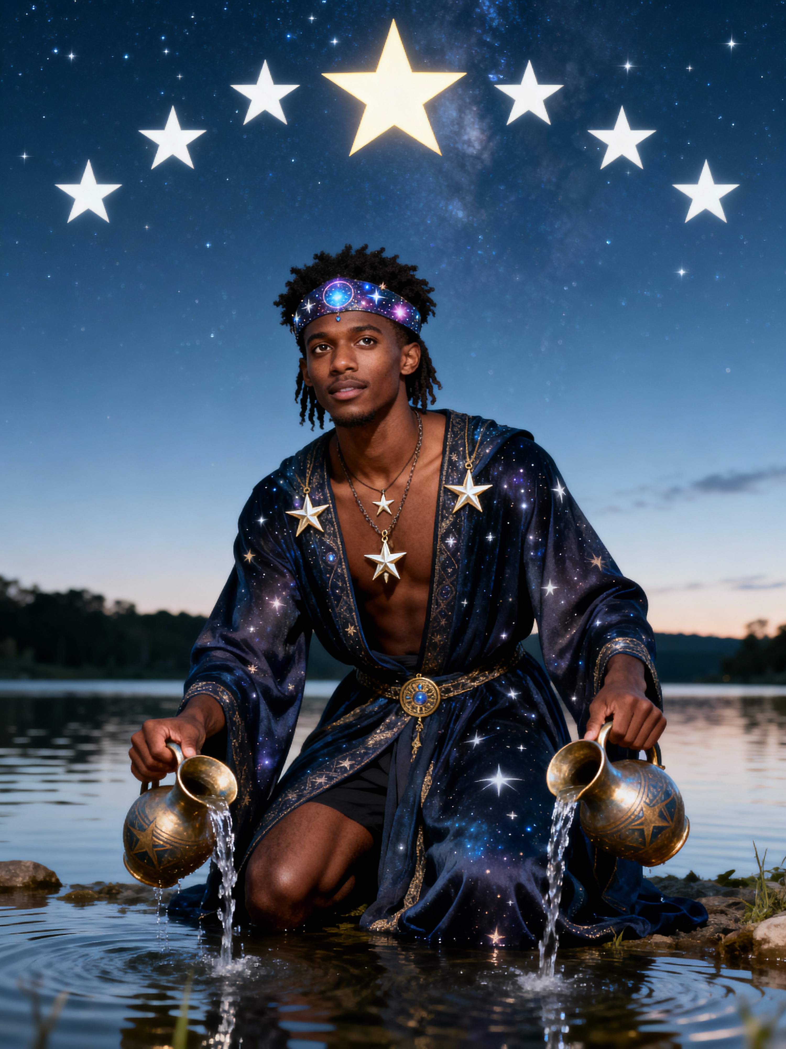 Tarot Card of The Star featuring model wearing celestial robes with star amulets and cosmic headpiece, kneeling by water, pouring water from two jugs, seven stars in night sky above, one large star prominent, hopeful serene expression, mystical landscape
