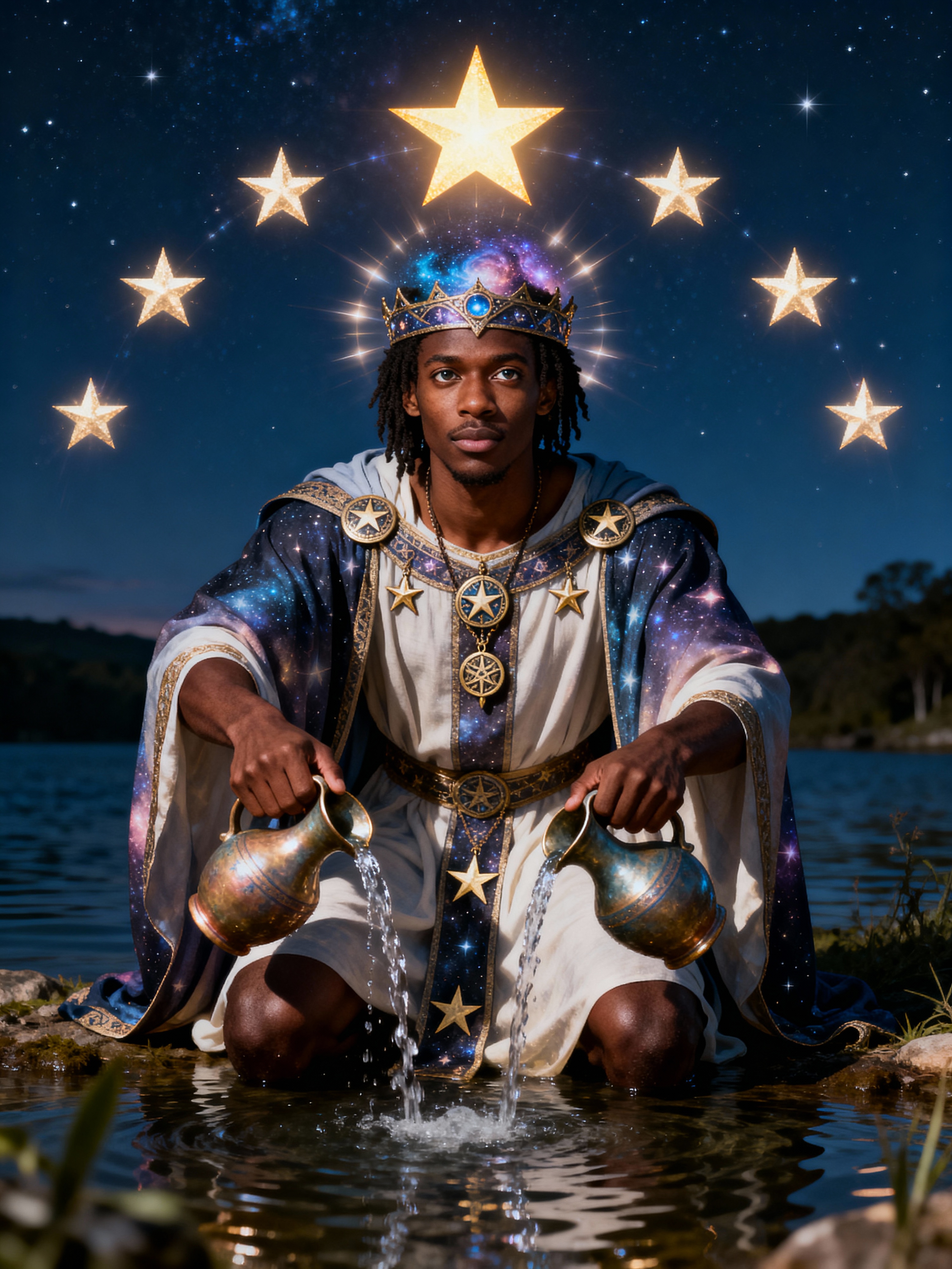 Tarot Card of The Star featuring model wearing celestial robes with star amulets and cosmic headpiece, kneeling by water, pouring water from two jugs, seven stars in night sky above, one large star prominent, hopeful serene expression, mystical landscape