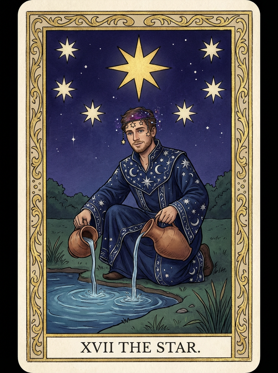 Tarot Card of The Star featuring model wearing celestial robes with star amulets and cosmic headpiece, kneeling by water, pouring water from two jugs, seven stars in night sky above, one large star prominent, hopeful serene expression, mystical landscape