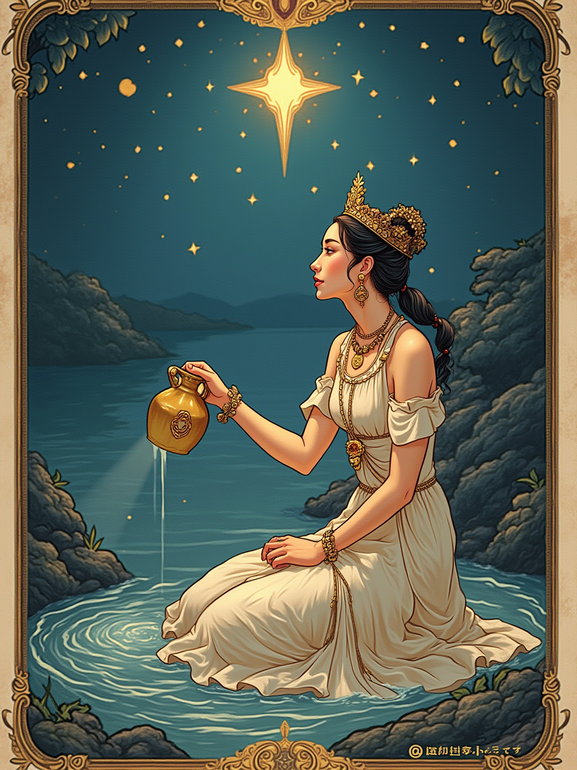 Tarot Card of The Star featuring model wearing flowing ethereal gown with star jewelry and celestial crown , kneeling by water, pouring water from two jugs, seven stars in night sky above, one large star prominent, hopeful serene expression, mystical landscape