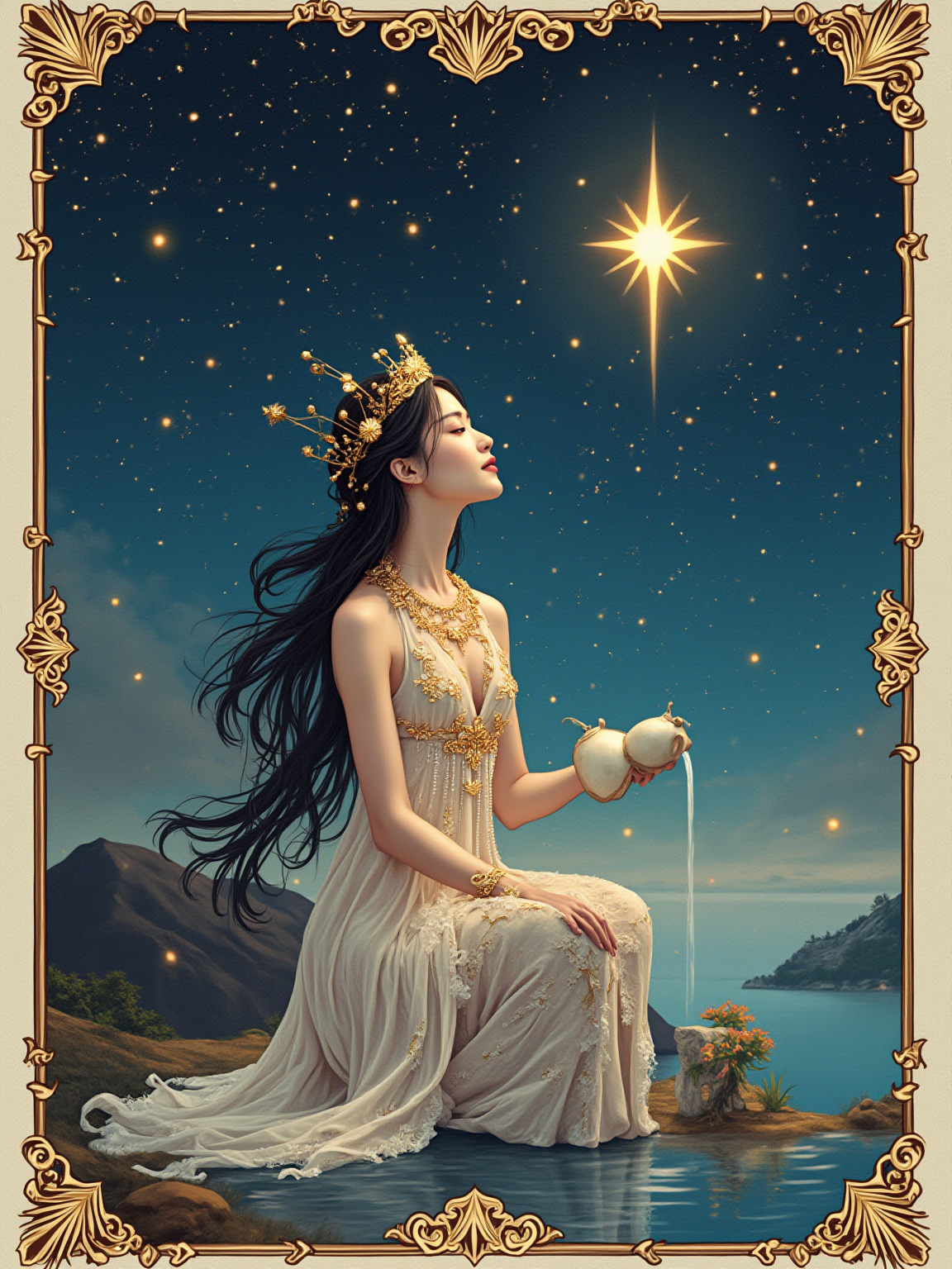 Tarot Card of The Star featuring model wearing flowing ethereal gown with star jewelry and celestial crown , kneeling by water, pouring water from two jugs, seven stars in night sky above, one large star prominent, hopeful serene expression, mystical landscape