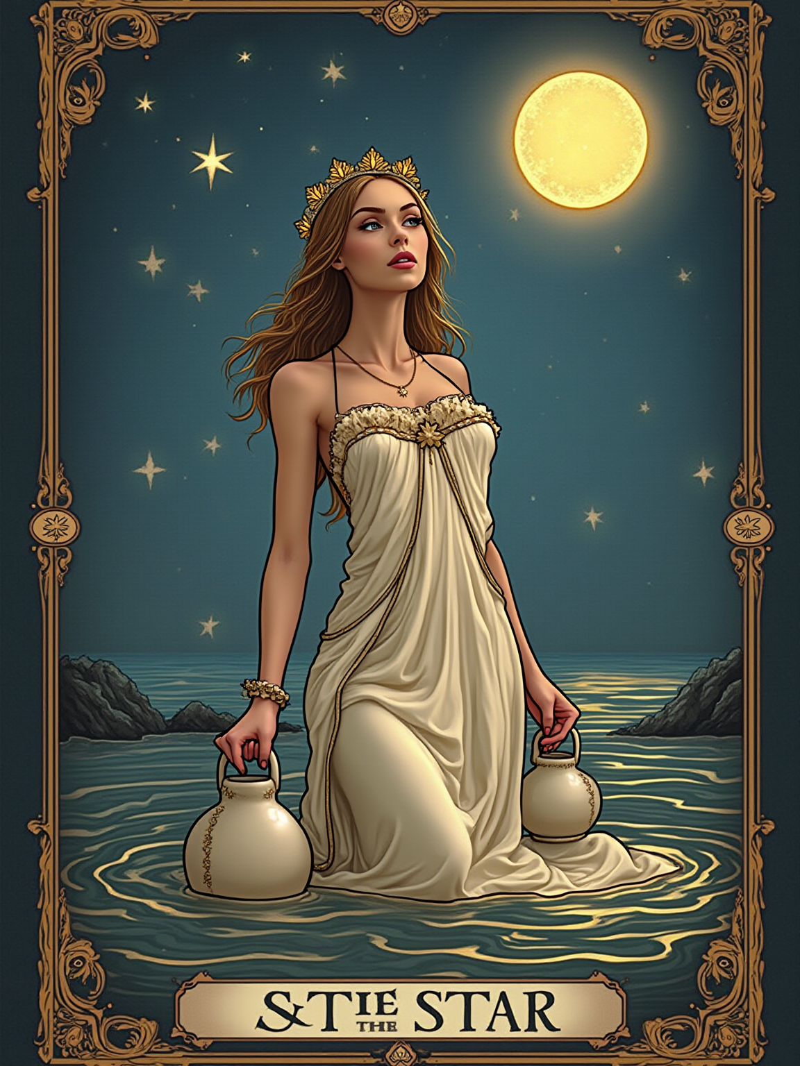 Tarot Card of The Star featuring model wearing flowing ethereal gown with star jewelry and celestial crown , kneeling by water, pouring water from two jugs, seven stars in night sky above, one large star prominent, hopeful serene expression, mystical landscape